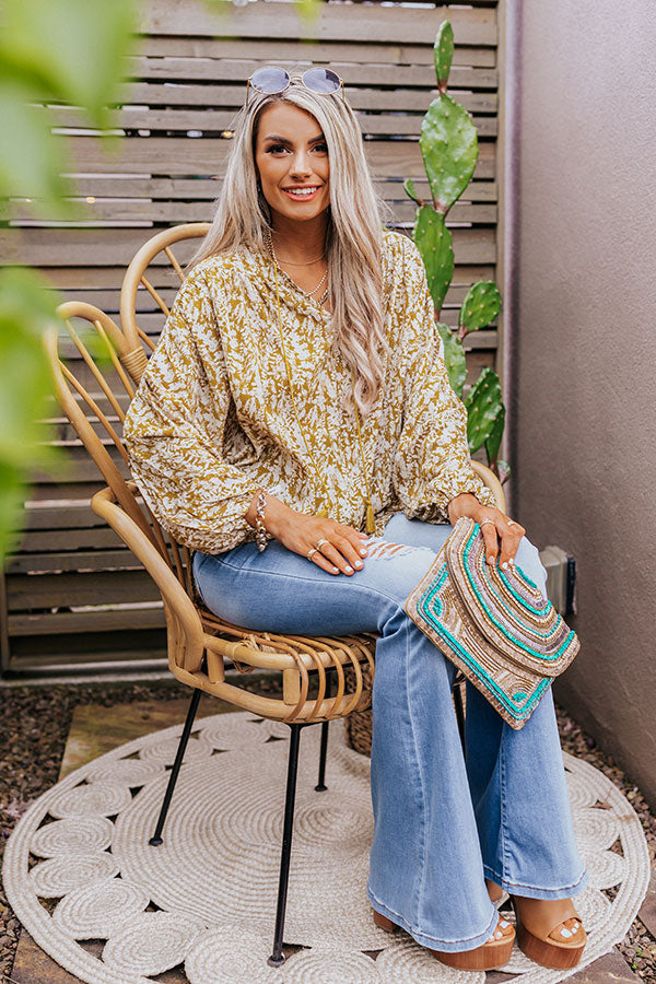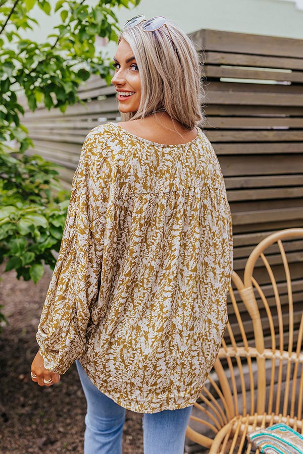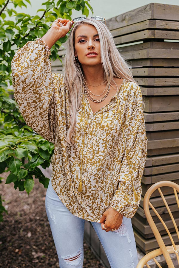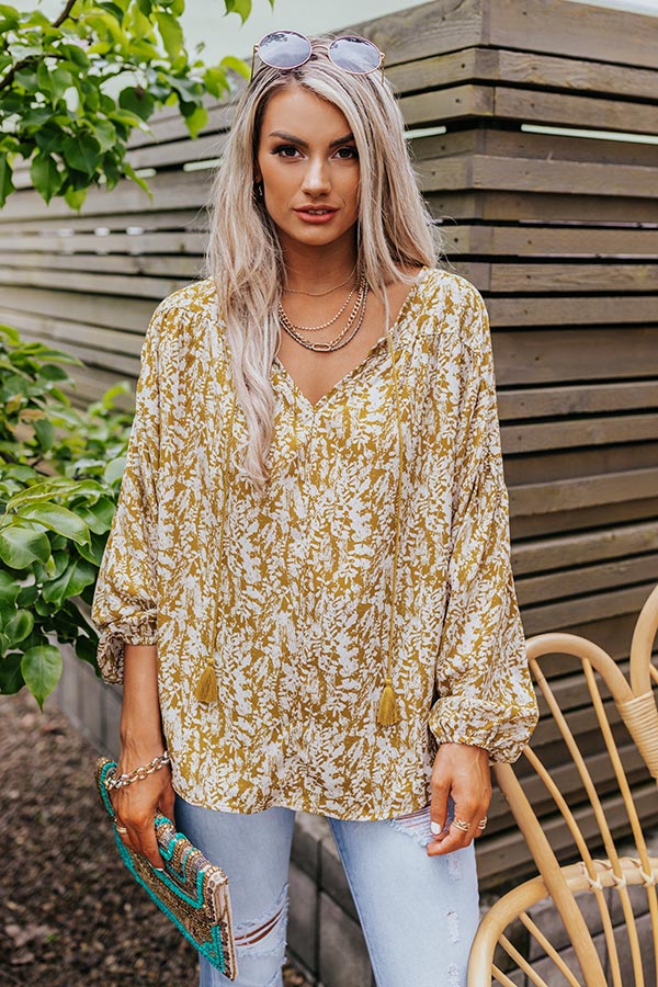 We have no doubt this pretty shift top will be popular among fashionistas with its lightweight breezy material, golden honey hued floral print, tie closure v-cut neckline, long oversized sleeves, and draped silhouette that falls into a rounded hemline! Measurements