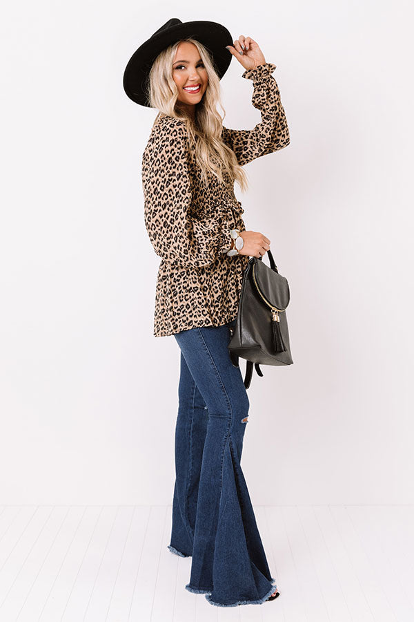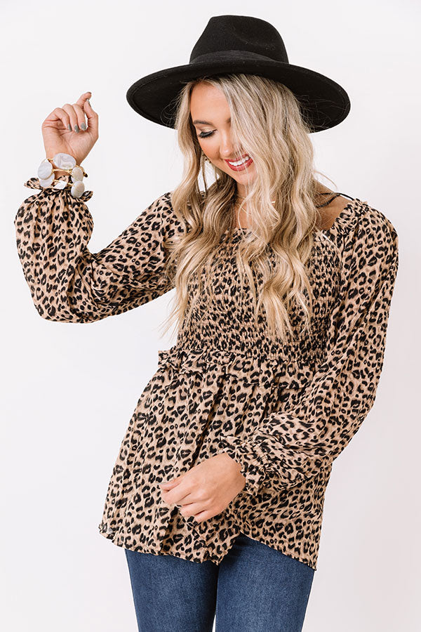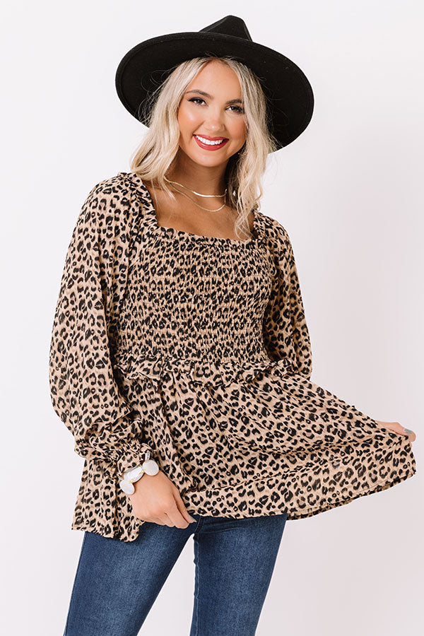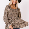 Back by popular demand, this stunning tan top features lightweight material patterned with a large black leopard print, a square neckline and upper back, long bubble sleeves with fitted cuffs, flattering form fitting smocked detailing around the bodice, a large ruffled seam at the waist, and a shift peplum bottom that ends in an uneven hemline!