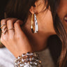 Stay on trend with these popular earrings featuring dangling gold teardrop hoops patterned with a black and white leopard print!