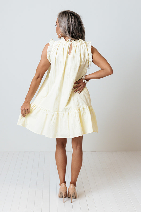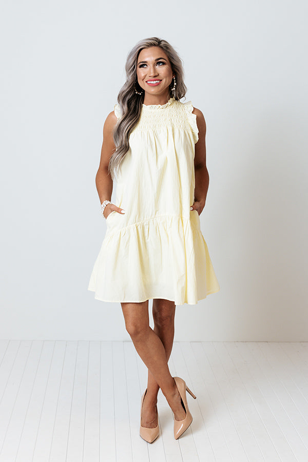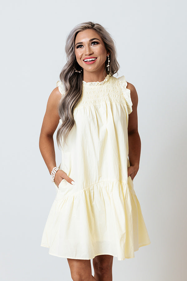 Take on summer in our adorable light yellow 'Porch Swing Sippin' Dress' featuring lightweight flowy material, a smocked upper bodice with a high rounded neckline, sleeveless shoulders with ruffle trim detailing, a keyhole accented upper back with a button closure, and a relaxed silhouette that falls into a wide peplum bottom with an uneven mid-thigh length hemline! Measurements