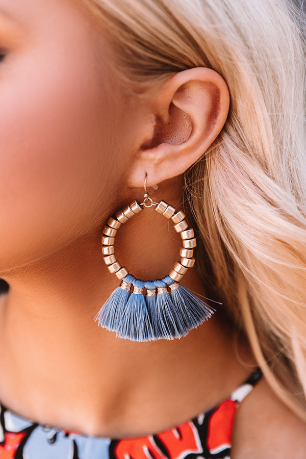 Good things come in small packages, especially when it's new jewelry! Our adorable 'Port Side' statement earrings feature dangling gold beaded hoops with airy blue colored tassel fans!
