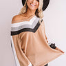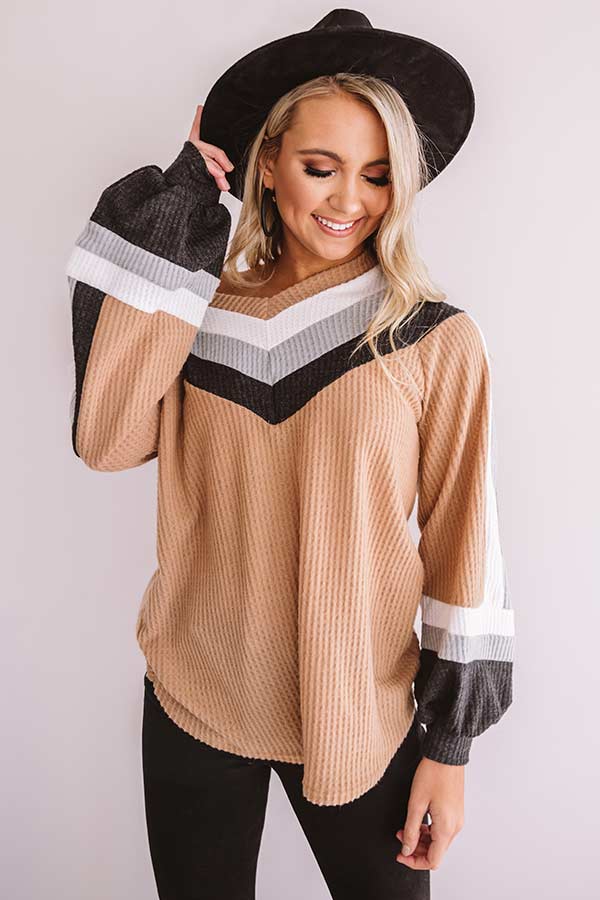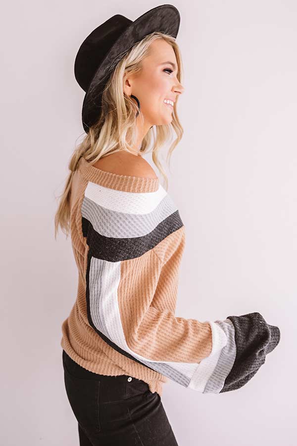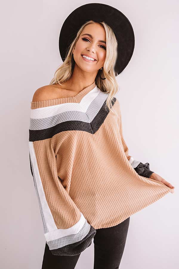 You are sure to look "posh and proper" when you wear this adorable top featuring soft lightweight material with waffle knit texturing, a wide v-cut neckline that can be worn off one shoulder, black, white, and grey accent stripes, long oversized sleeves with fitted cuffs, and a relaxed silhouette that falls into a rounded hemline! We have styled this transitional piece with some flares, snake print booties, and a black fringe crossbody and faux suede hat, but you can also wear it with some distressed light wash ankle skinnies and "The Seraphina Faux Leather Wedge in Grey!" Measurements