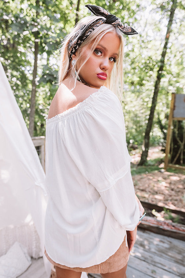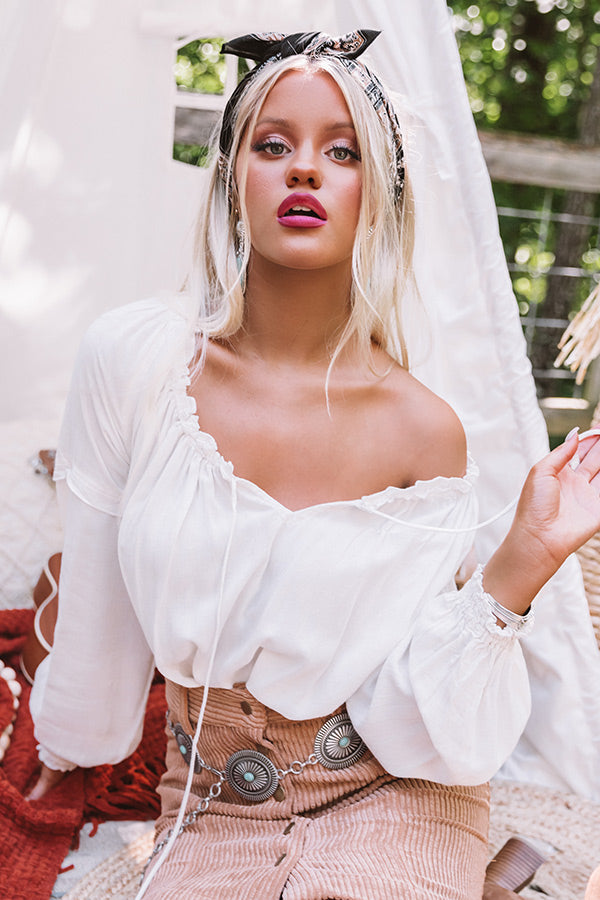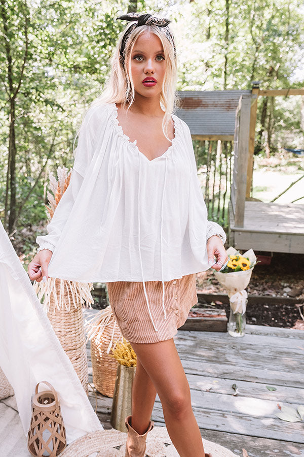 Strike a pose in this darling stone colored top featuring lightweight breezy material with subtle texturing, a v-cut neckline with ruffled trim detailing and a tie closure, long bubble sleeves with elastic cuffs, and a relaxed silhouette that falls into a rounded hemline! We have styled this cutie with a corduroy skirt, brown booties, a matching hair scarf, and a concho belt, but you can also wear it with some dark wash flares, "The Portia Faux Leather Peep Toe Bootie in Stone," and our "Sense Of Style Woven Bag in Stone!"