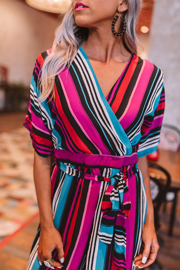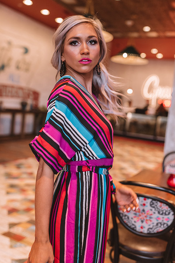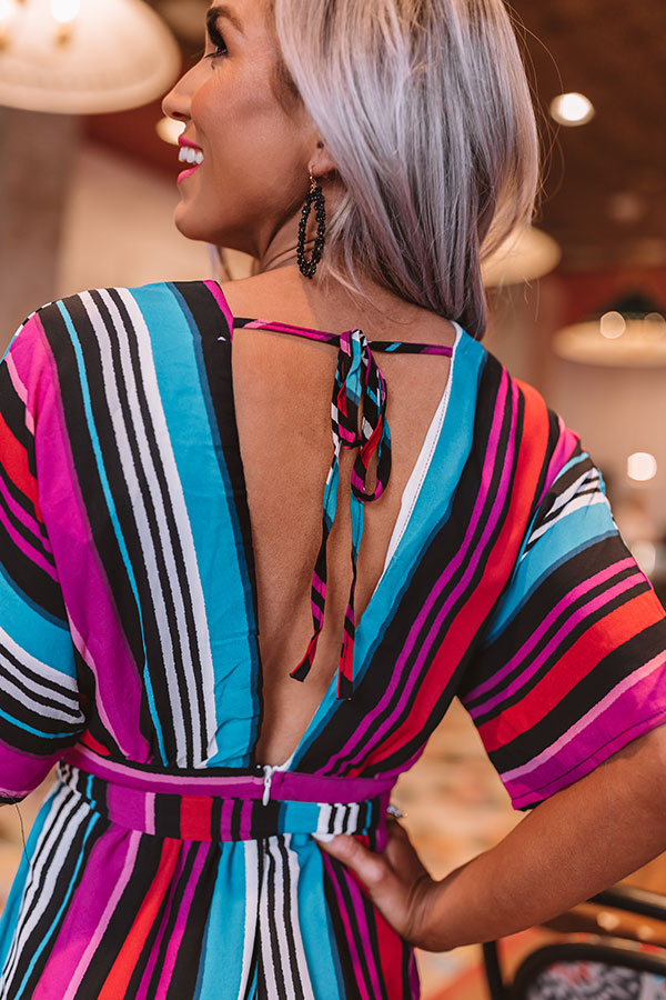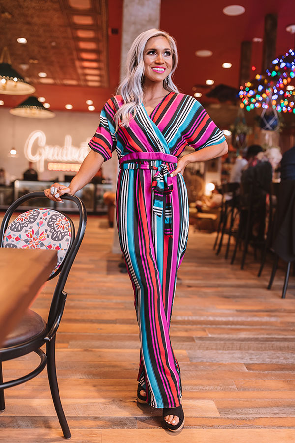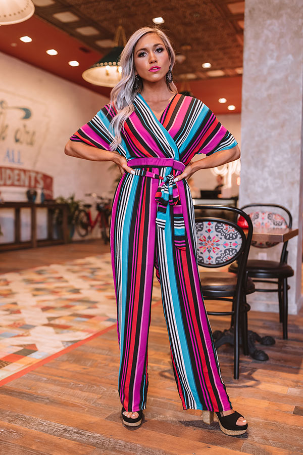 There is no better piece for "posing on the pier" or stopping to "stripe" a pose in than this adorable jumpsuit featuring lightweight stretchy material patterned with vibrant colorful accent stripes, loose short sleeves, an empire cut surplice bodice with a modest snap closure, a v-cut neckline and upper back with a tie across the shoulders, a fitted sash belted waist with a zipper in the back, and a relaxed high waisted pant silhouette that falls into straight ankle length hemlines! Style this piece with black heels and a matching clutch for the perfect vacay look!