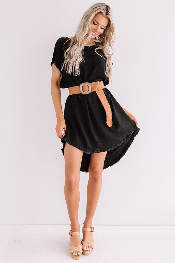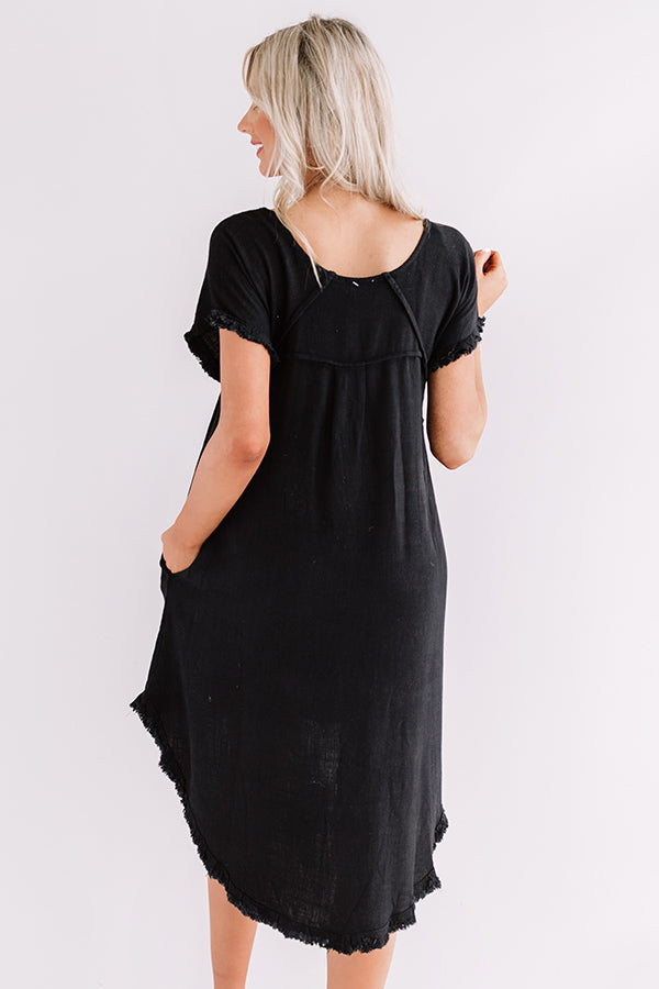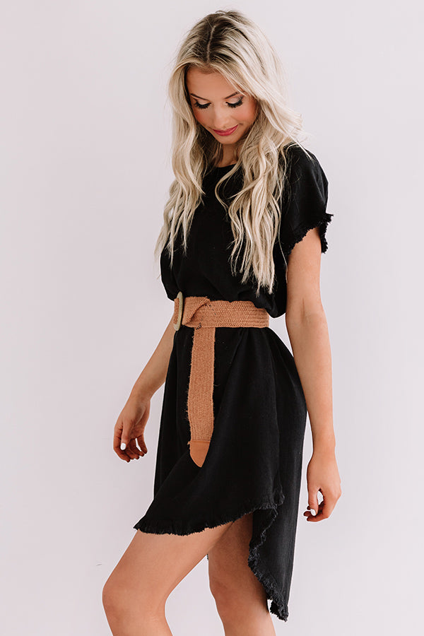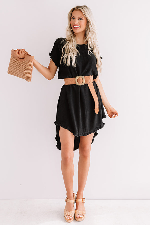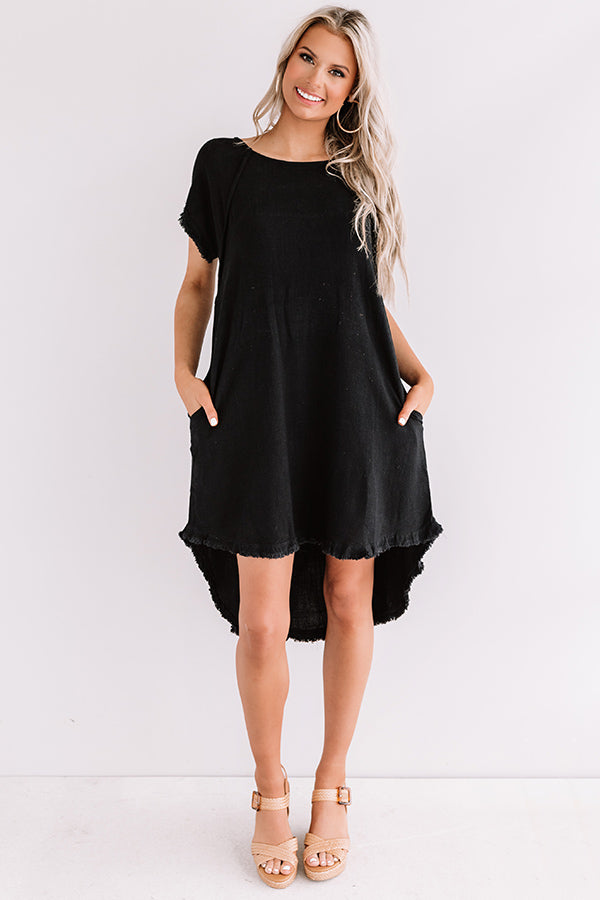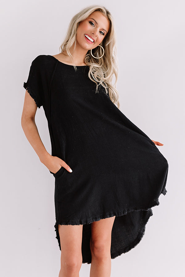 Our casual black "Positano Party" shift dress is an everyday closet essential with its soft lightweight canvas like material, a high rounded neckline, short loose sleeves, subtle fringed edge detailing, exposed accent seams, accent side pockets, and a relaxed silhouette that falls into a rounded high/low hemline! We have styled this simple but significant piece with a neutral belt and wedge, but you can also wear it layered under a cropped denim jacket with "The Penn Platform Sneaker in Cheetah Print" and matching cheetah print hair scarf! Measurements