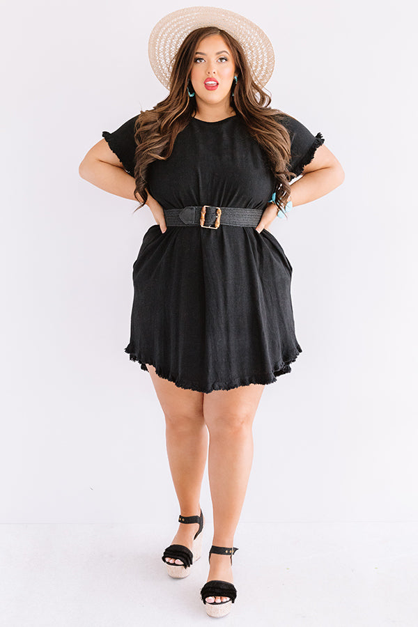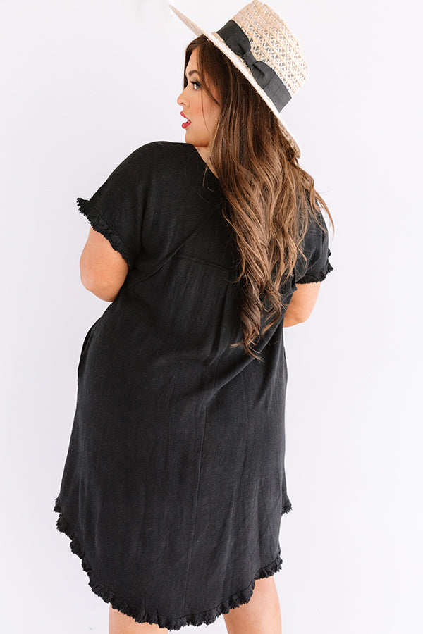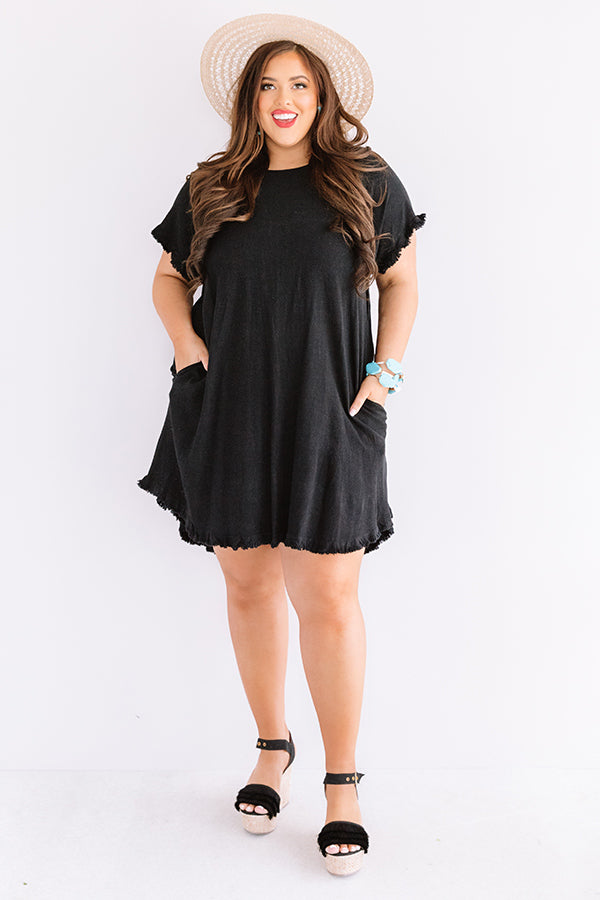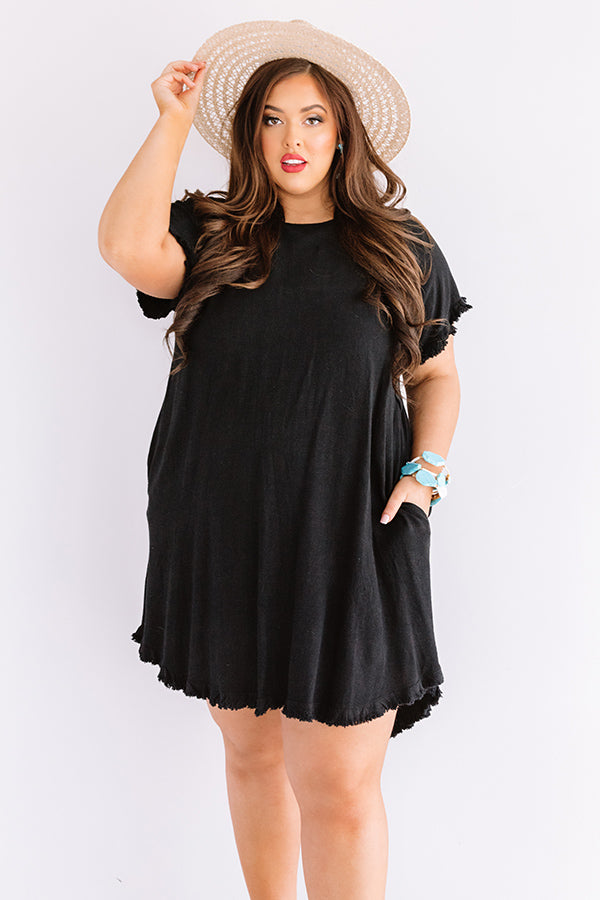 Plus Size - Our casual black "Positano Party" shift dress is an everyday closet essential with its soft lightweight canvas like material, a high rounded neckline, short loose sleeves, subtle fringed edge detailing, exposed accent seams, accent side pockets, and a relaxed silhouette that falls into a rounded high/low hemline! We have styled this simple but significant piece with a woven hat and a black wedge and statement belt, but you can also wear it layered under a cropped denim jacket with "The Saylie Peep Toe Heel in Blush" and our "Bryant Park Views Quilted Crossbody in Blush!" Measurements