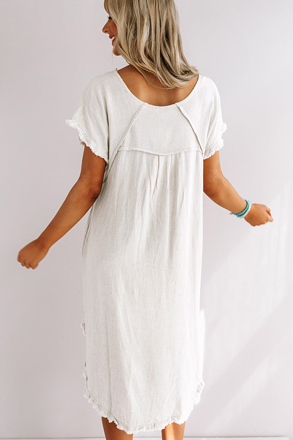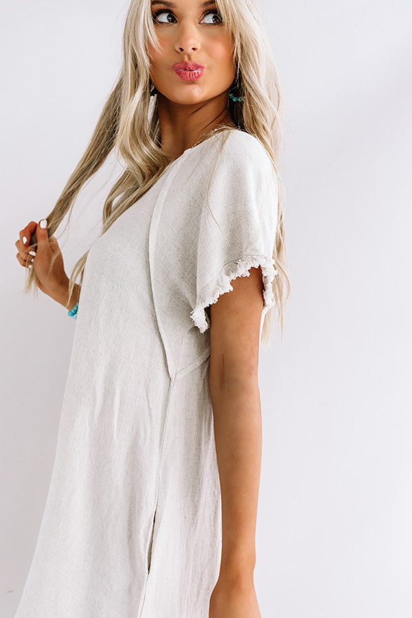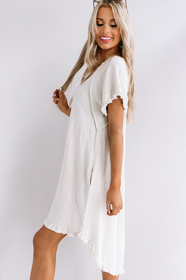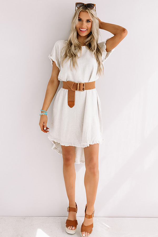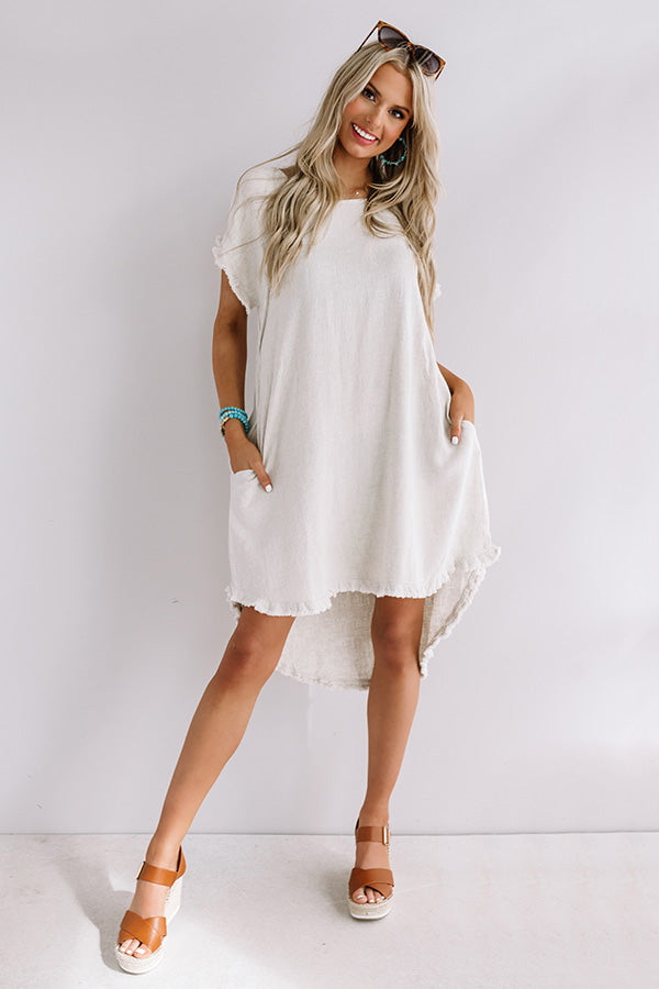 Our casual stone colored "Positano Party" shift dress is an everyday closet essential with its soft lightweight canvas like material, a high rounded neckline, short loose sleeves, subtle fringed edge detailing, exposed accent seams, accent side pockets, and a relaxed silhouette that falls into a rounded high/low hemline! We have styled this simple but significant piece with some sunnies and a cinnamon belt and wedge, but you can also wear it layered under a cropped denim jacket with "The Saylie Peep Toe Heel in Blush" and our "Bryant Park Views Quilted Crossbody in Blush!"