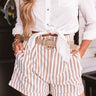 Keep your summer style simple but sophisticated 'Positano Pier Shorts' featuring lightweight material patterned with brown vertical accent stripes, a pleated waistline with belt loops, accent side pockets, a hidden zip closure, and a flattering silhouette that ends in straight upper-thigh length hemlines! Measurements