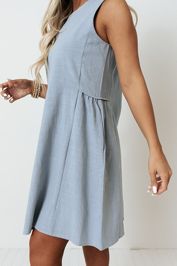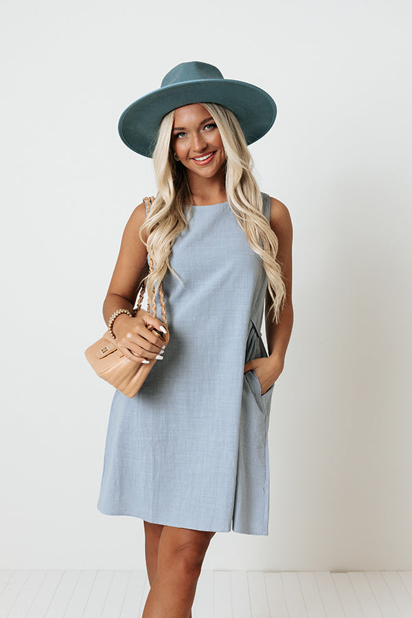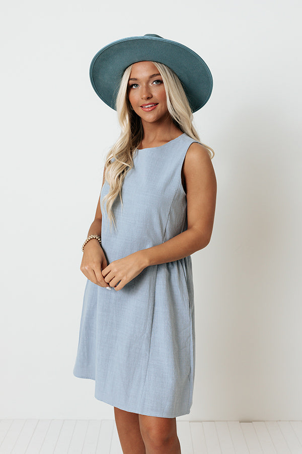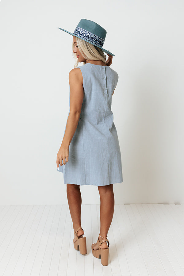 You are guaranteed to look pretty in this classy airy blue hued dress featuring lightweight material, a high rounded neckline, wide shoulder straps, a three button up back, and a flattering silhouette that ends in a straight mid-thigh length hemline! Measurements