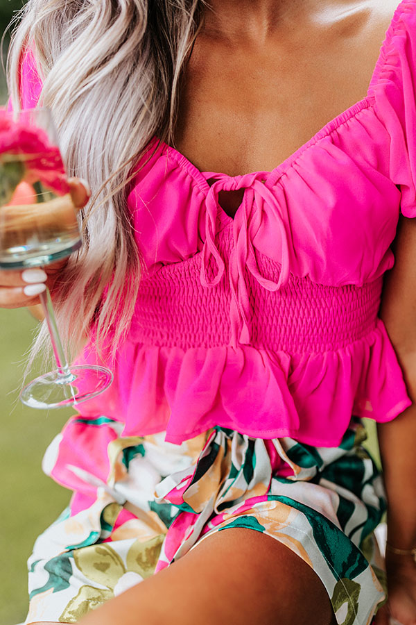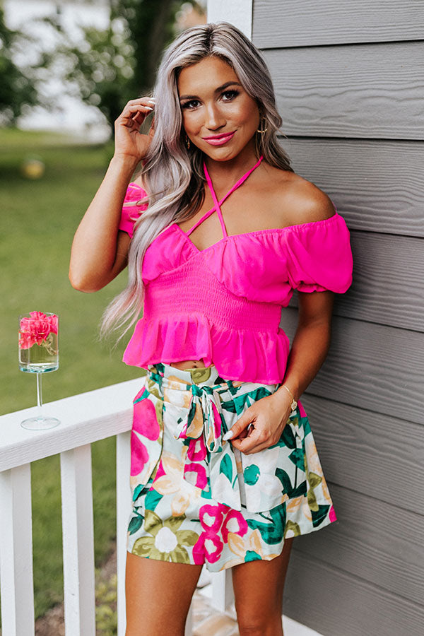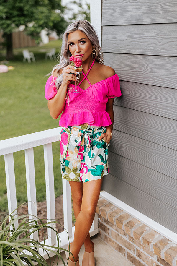 We have no doubt you will look so pretty in this beautiful top featuring a flirty wide v-cut neckline with tie straps that can be left untied or tied around the neck for a variety of looks, short puff drop sleeves, a smocked waistline, and a peplum silhouette!