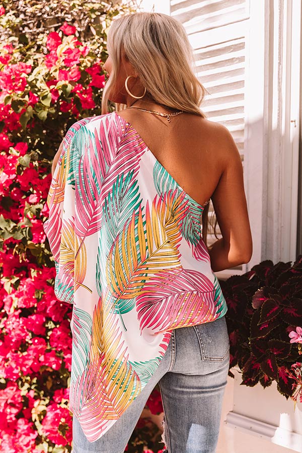 Our flirty 'Postcard From Palm Springs Top' features lightweight breezy material patterned with oversized pink, teal, and mustard hued palm leaves, a diagonal neckline and upper back with an oversized bat wing half sleeve, and an ultra slouched silhouette that falls into an uneven hemline! Measurements