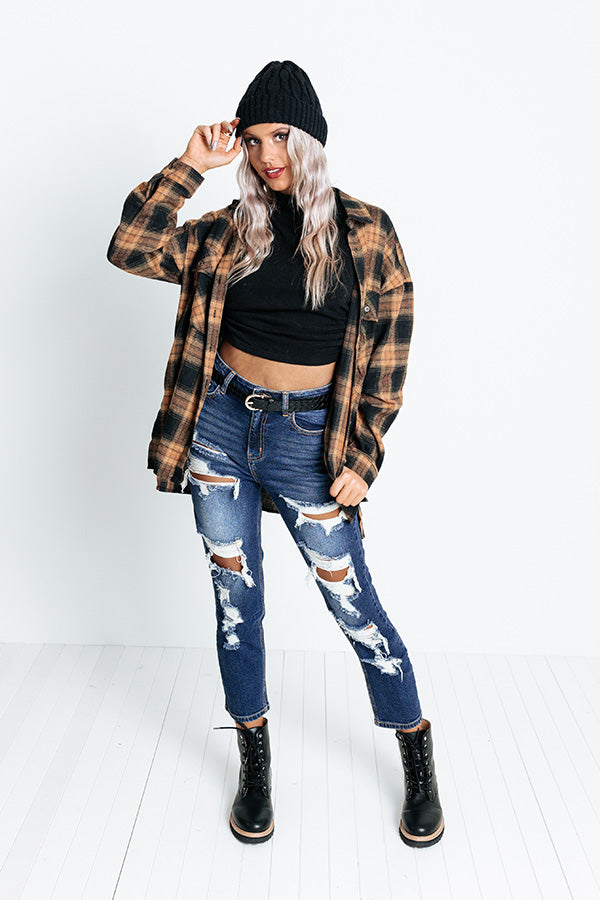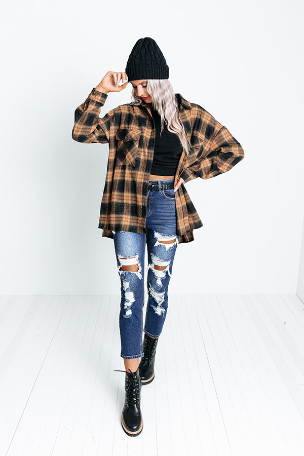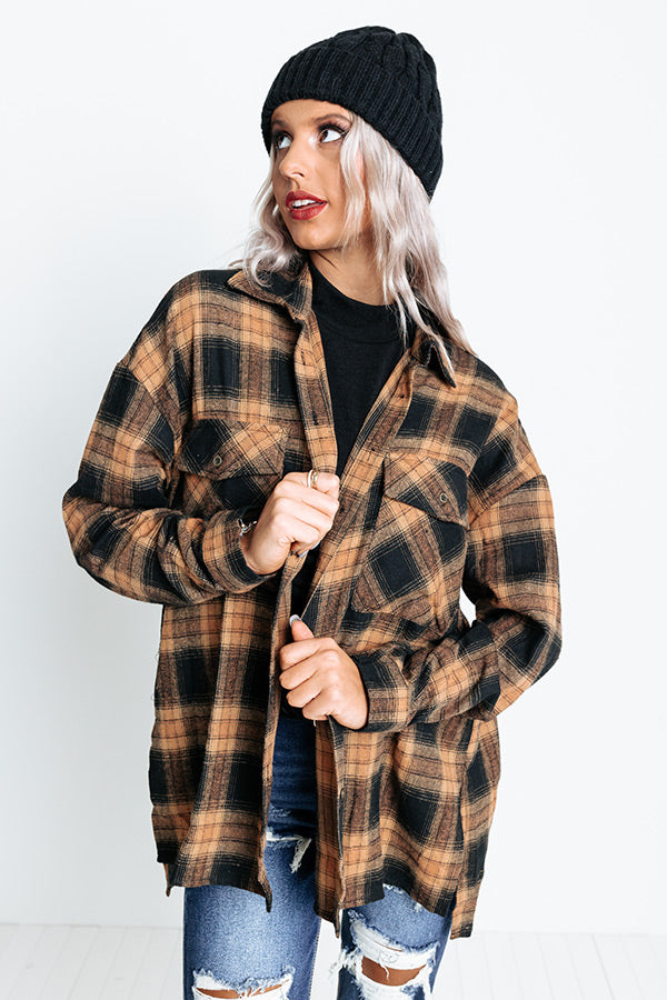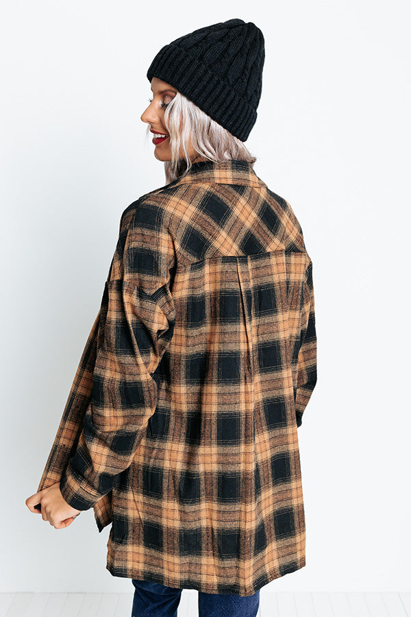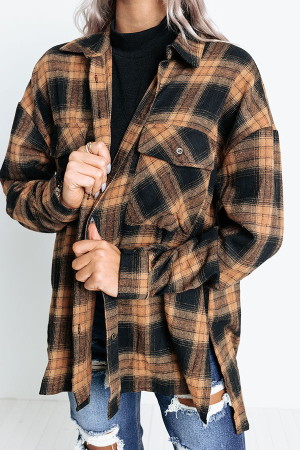 Stay on trend this fall with our timeless camel colored 'Pouring Cider' top featuring lightweight material patterned with a black plaid print, button down front with a collared neckline, long loose sleeves with button closure cuffs, two accent chest pockets with flap closures, and relaxed silhouette that falls into a straight hemline! Measurements