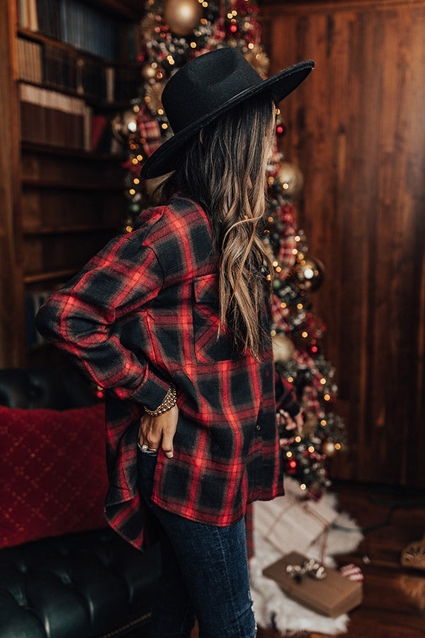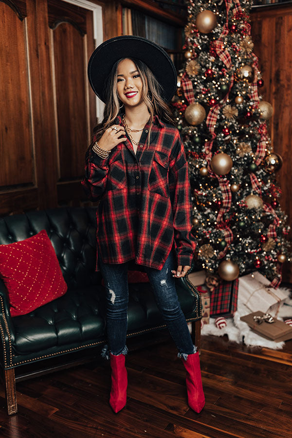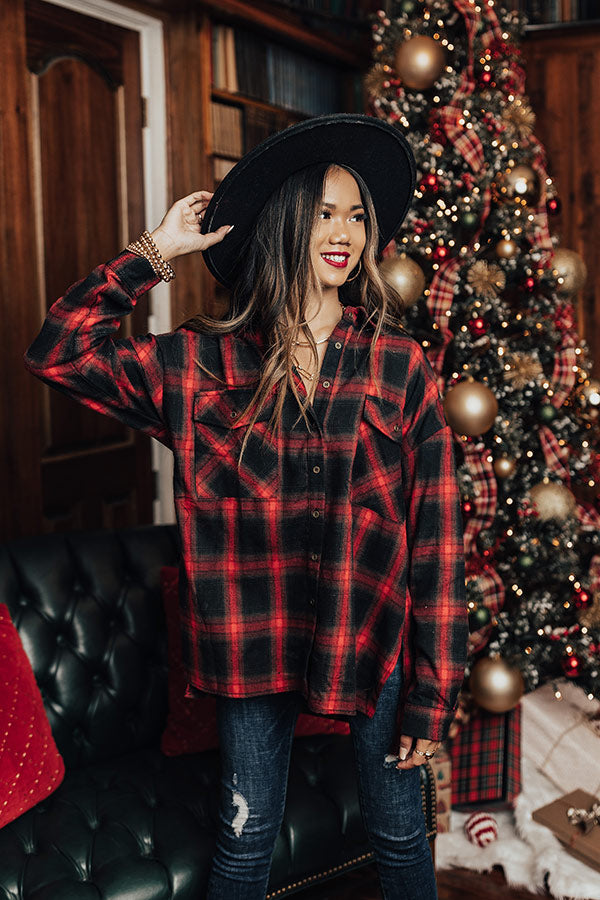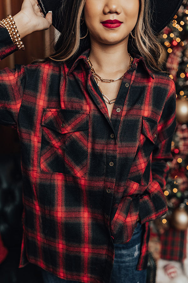 Stay on trend this fall with our timeless red 'Pouring Cider' top featuring lightweight material patterned with a black plaid print, button down front with a collared neckline, long loose sleeves with button closure cuffs, two accent chest pockets with flap closures, and relaxed silhouette that falls into a straight hemline! Measurements