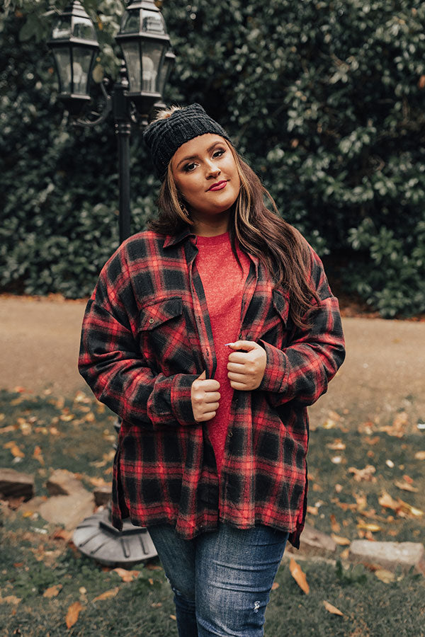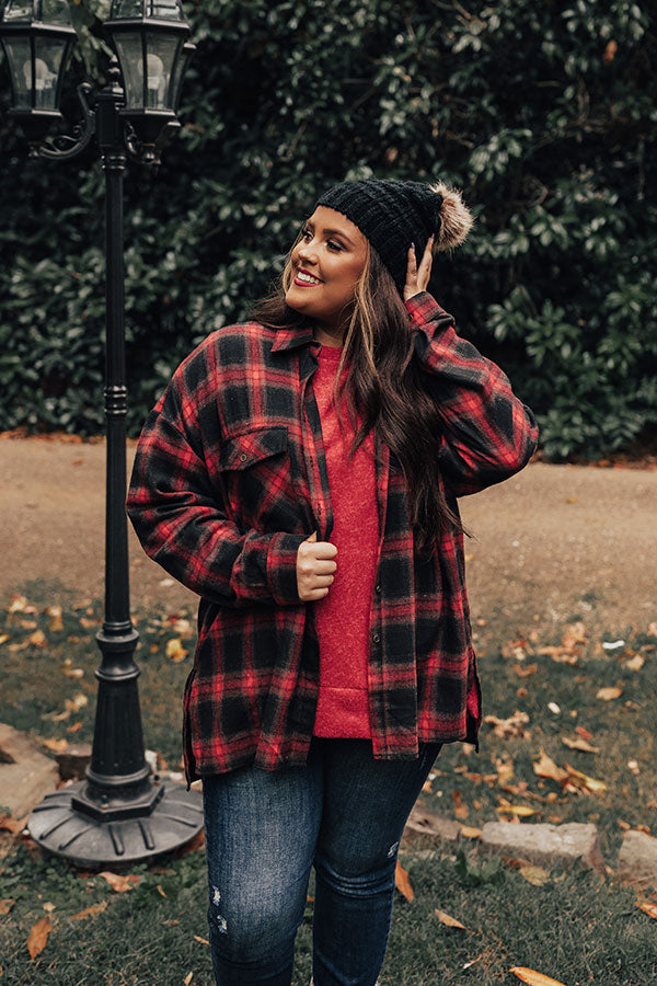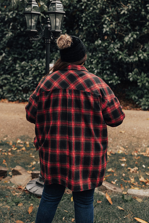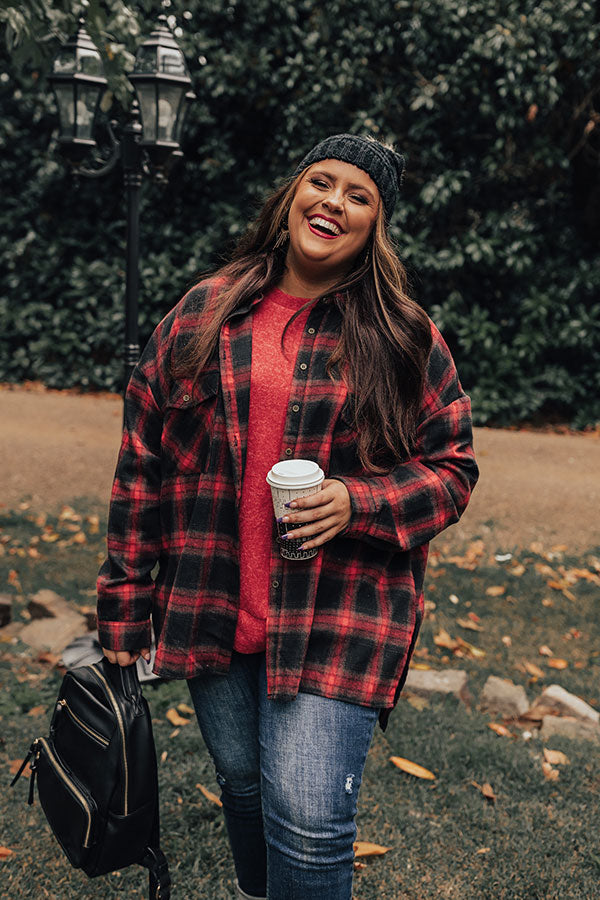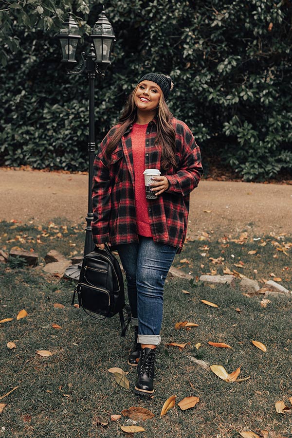 Stay on trend this fall with our timeless plus size red 'Pouring Cider' top featuring lightweight material patterned with a black plaid print, button down front with a collared neckline, long loose sleeves with button closure cuffs, two accent chest pockets with flap closures, and relaxed silhouette that falls into a straight hemline! Measurements