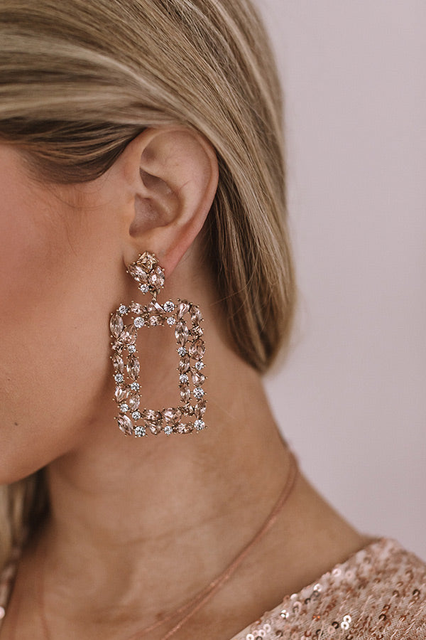 You will surely be "prepared to party" when you accessorize with these rose gold statement earrings featuring large dangling abstract clear rhinestone rectangles!