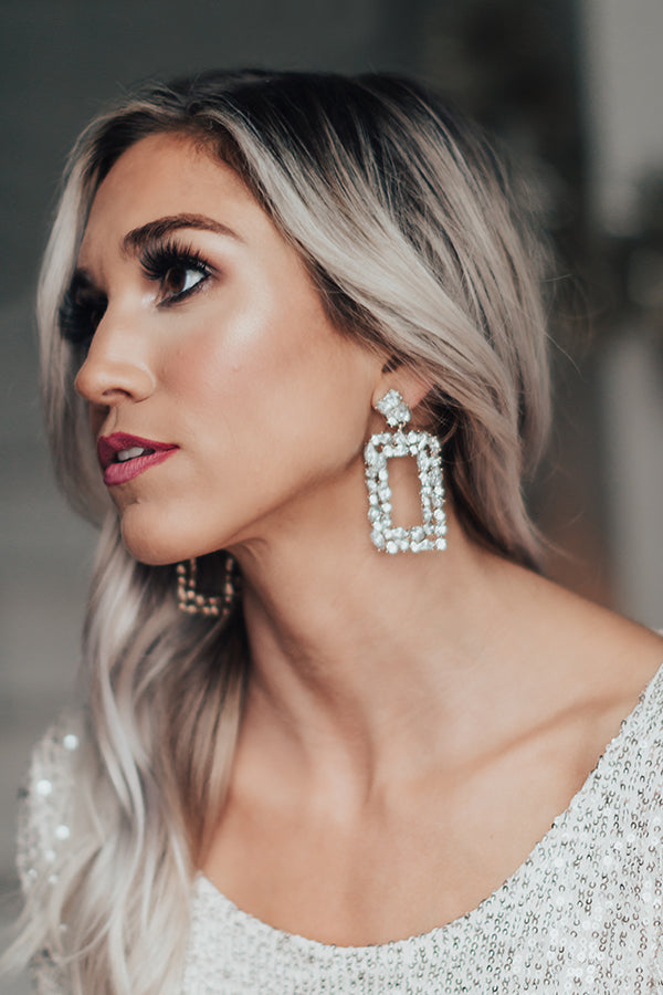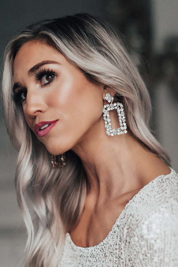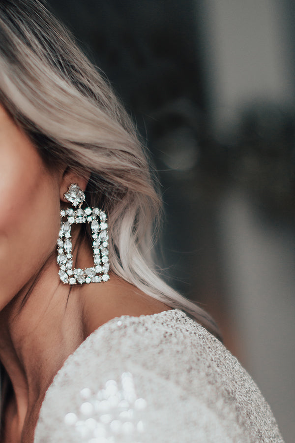 You will surely be "prepared to party" when you accessorize with these silver statement earrings featuring large dangling abstract clear rhinestone rectangles!