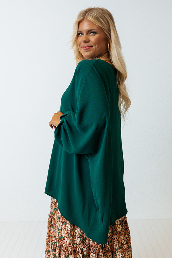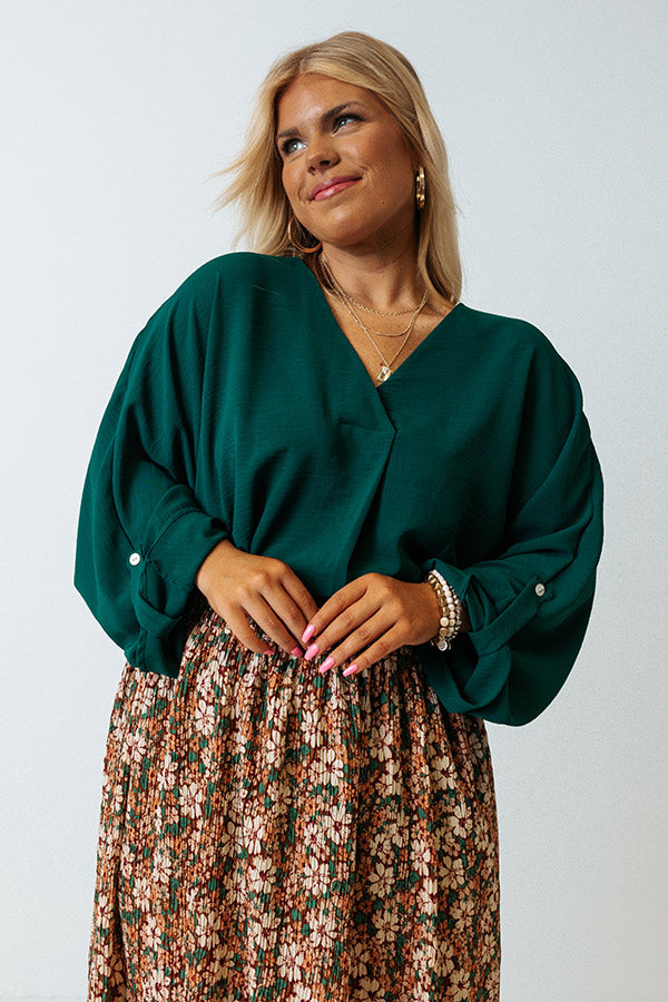 A classy and chic option, our practical hunter green plus size 'Press Room Shift Top' features lightweight material, a v-cut neckline, loose 3/4-length sleeves with roll-tab cuffs, and a relaxed silhouette that falls into a straight hemline!