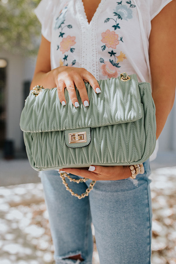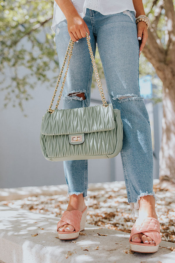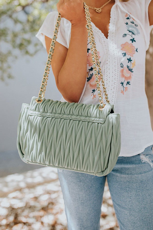 Upgrade your look with our luxe pear colored 'Pressed For Petals' tote featuring faux leather material with puckered texturing, a flap closure with gold twist hardware, an adjustable chain link shoulder strap, and a spacious pouch with an additional inside zip closure pocket!