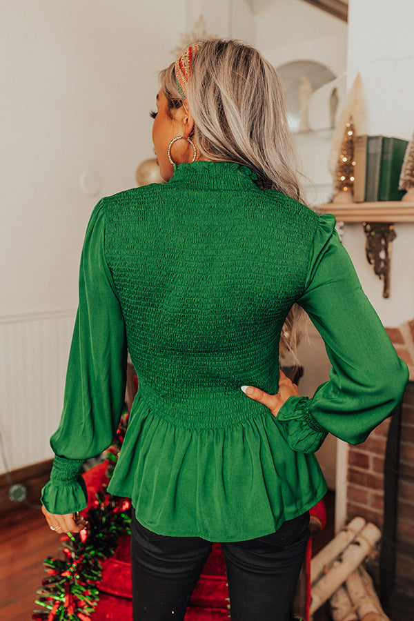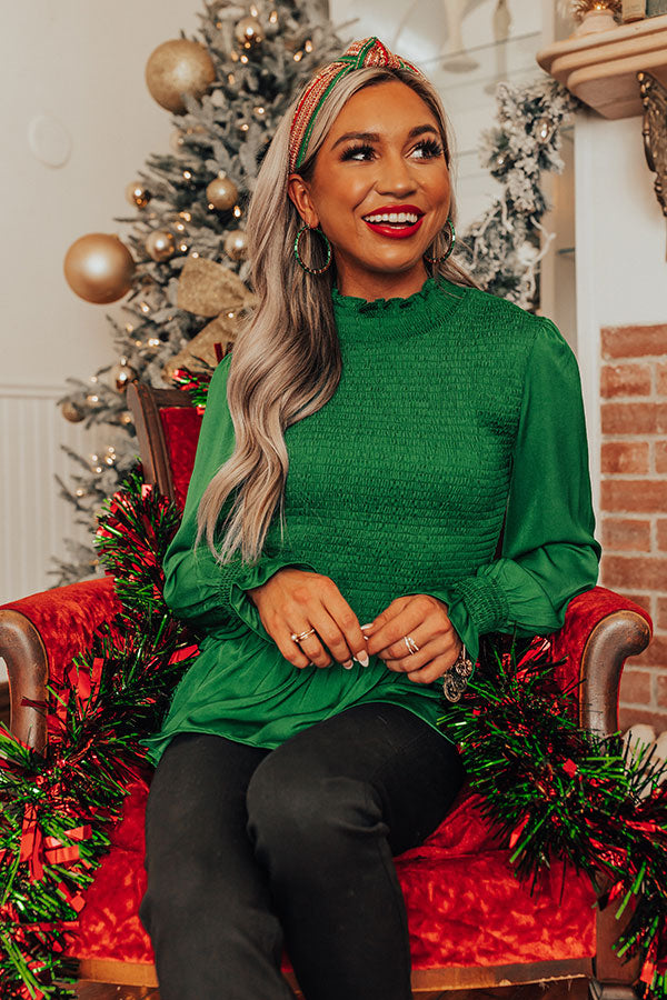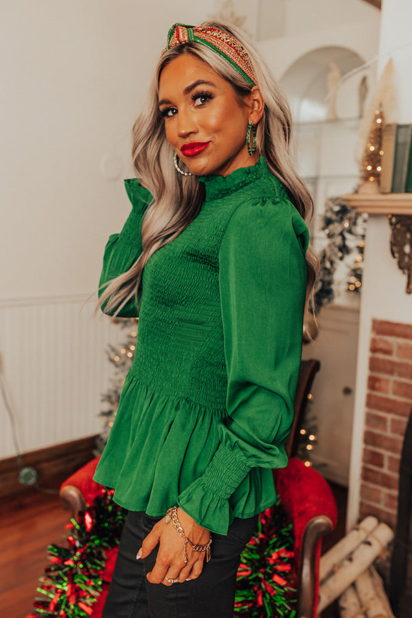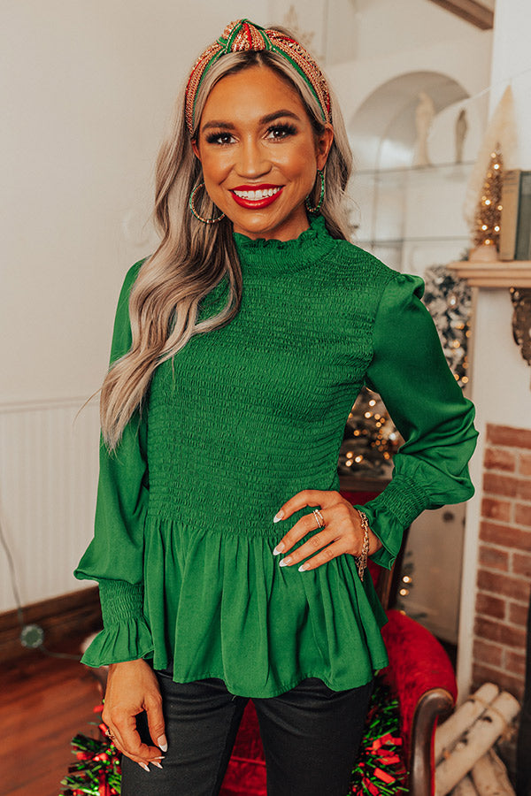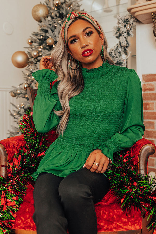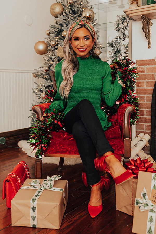 - Long, loose sleeves with smocked cuffs and ruffle detail