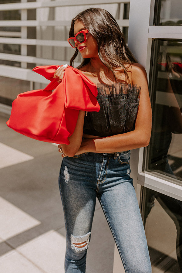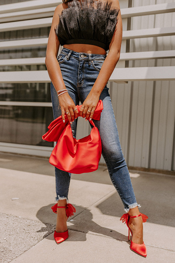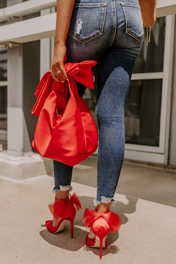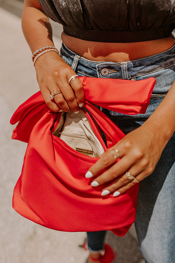 You are sure to be the prettiest girl in the room when you complete your look with this red hot purse featuring sleek material, a single handle with a large bow accent, and a slouched fully lined interior with a zip closure and an additional zip closure pocket inside!