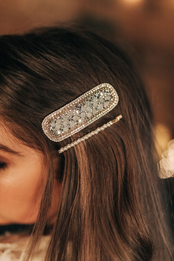 You are sure to look "pretty and poised" when you accessorize with this adorable pink hair clip set featuring a pearl bobby pin and a rectangular clip covered with airy blue, gold, and rhinestone beads!