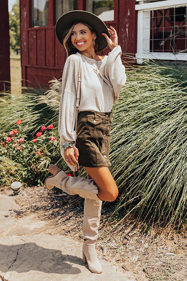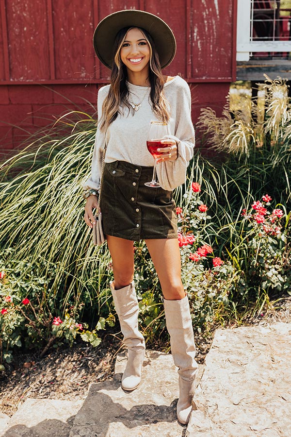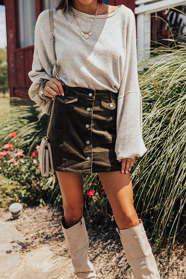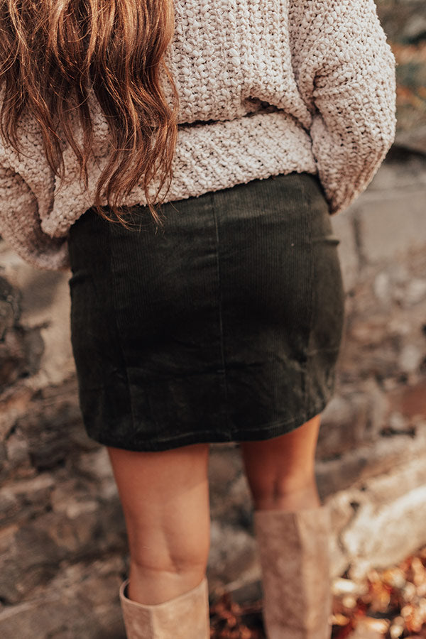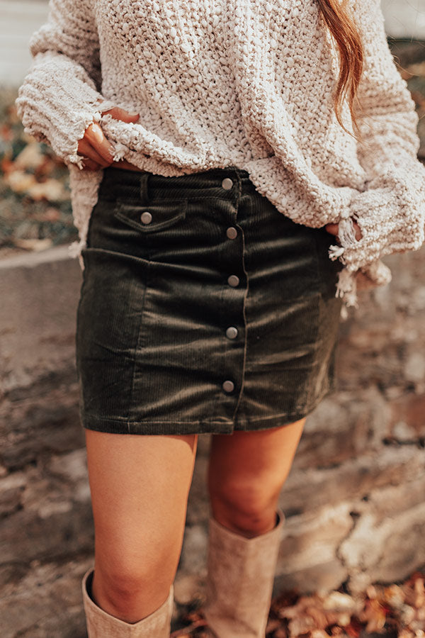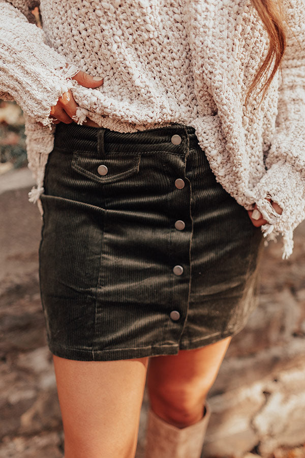 Show off your fearless style with this flirty army green colored skirt featuring soft lightweight corduroy material, a button down front, belt loops on the waistline with accent flap closure pockets, and a flattering form fitting silhouette that ends in a straight mid-thigh length hemline! Measurements