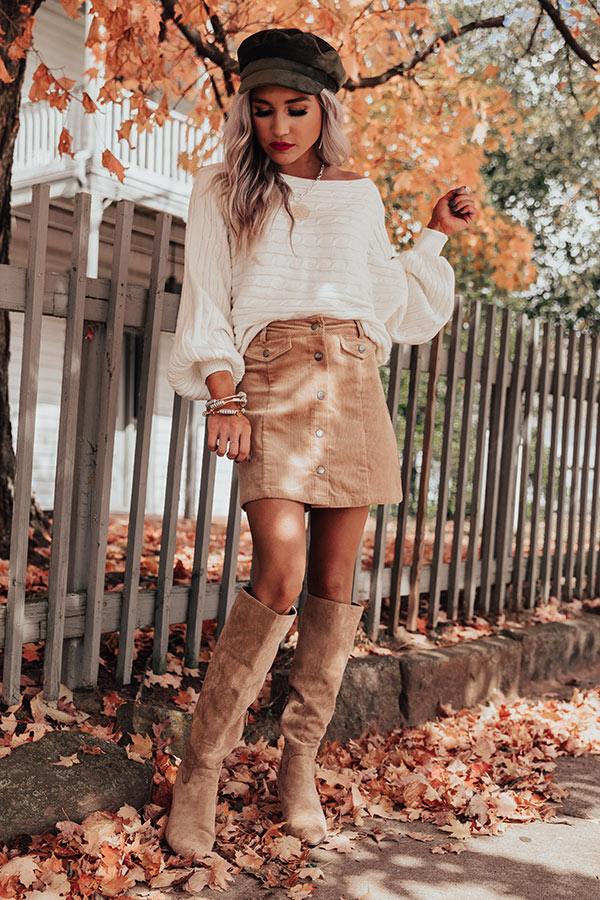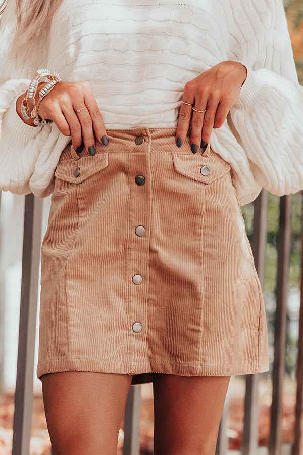 Show off your fearless style with this flirty iced latte colored skirt featuring soft lightweight corduroy material, a button down front, belt loops on the waistline with accent flap closure pockets, and a flattering form fitting silhouette that ends in a straight mid-thigh length hemline! Measurements