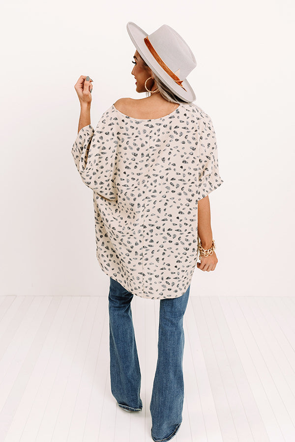 We have no doubt you will look so pretty in this charming stone hued shift top featuring lightweight flowy material patterned with an abstract dark spotted print, a wide v-cut neckline that can be worn off one shoulder, loose short sleeves, and an ultra draped silhouette that cascades into a rounded tunic-length hemline!