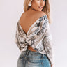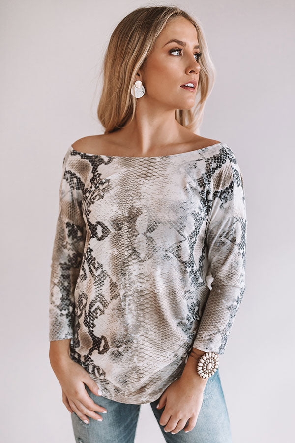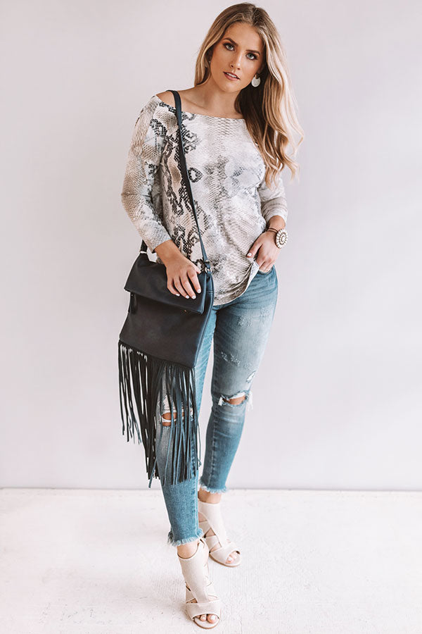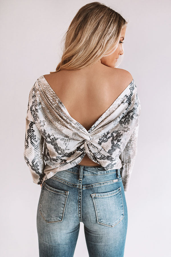 The spotlight will be on you when you wear this pretty top featuring a snake print pattern, a wrapped back that gathers in the middle, long sleeves, and a rounded neckline that falls in to a deep "v" in the back! This one and only top pairs beautifully with distressed skinnies, a neutral bootie, and a black fringe crossbody, but you an also style it with "The Blakely High Waist Flares in Black," a white faux suede hat, and "The Ayla Wedge in Black" for a show stopping outfit! Measurements