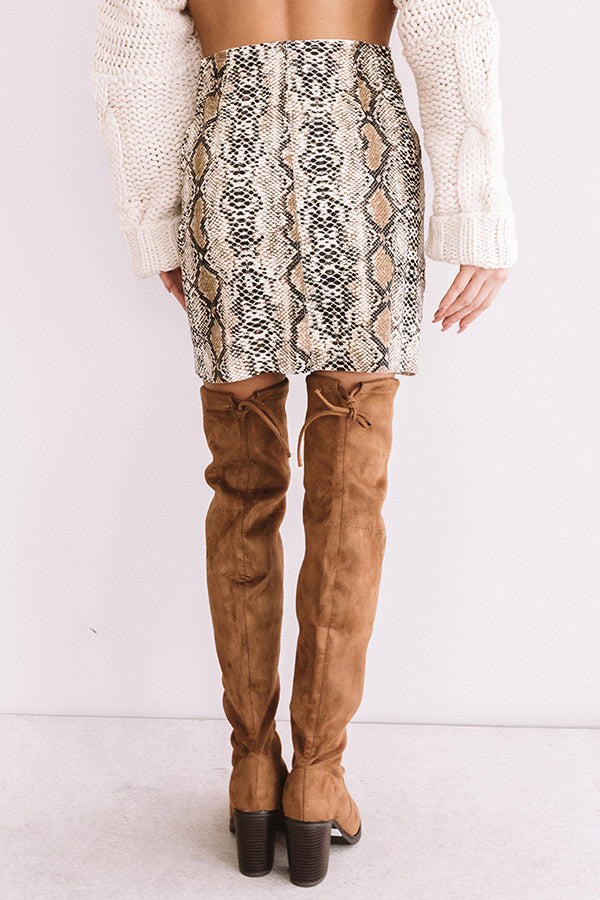 Your style is sure to be "pretty on point" when you wear this fierce and striking mini skirt featuring soft lightweight material patterned with a black and neutral snake print, a zip up back, and a form fitting silhouette that falls into a straight upper-thigh length hemline! We have styled this piece with a white sweater, neutral crossbody, and black over the knee boot, but you can also wear it with a basic black tank under our "Cute On Repeat Knit Cardigan in Ivory," a black faux suede hat, and "The Jess Faux Leather Heel in Natural!" Measurements