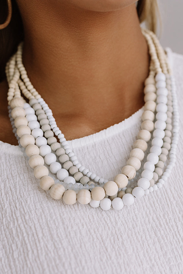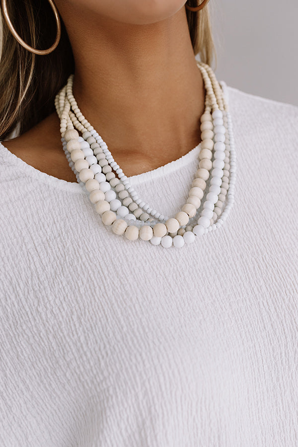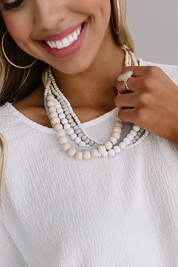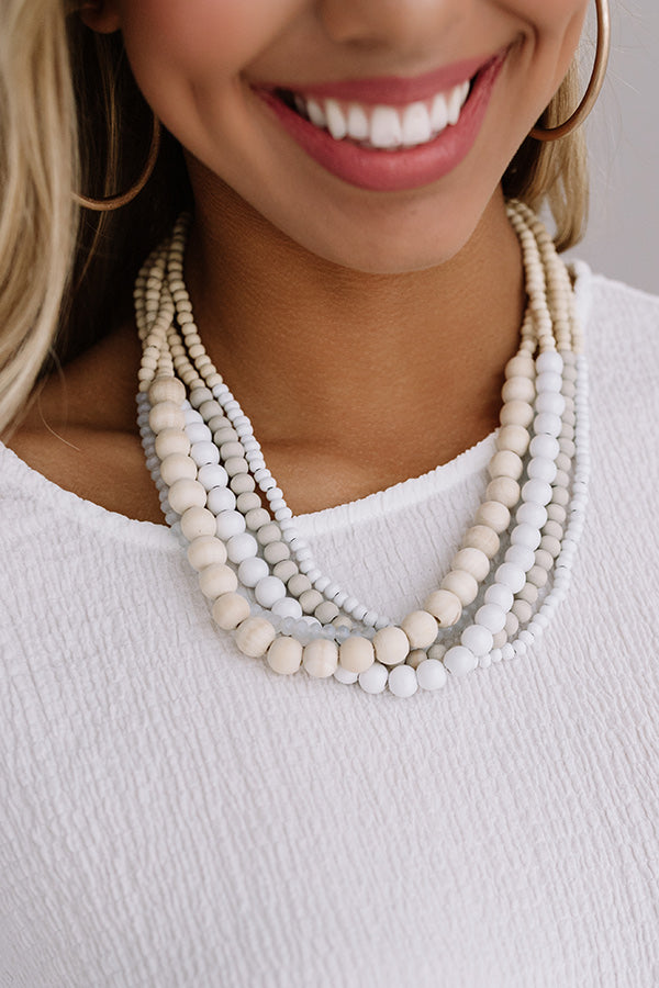 You are sure to look pretty when you accessorize with this adorable statement necklace featuring five layered pieces with rounded white, grey, and neutral hued beads!