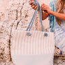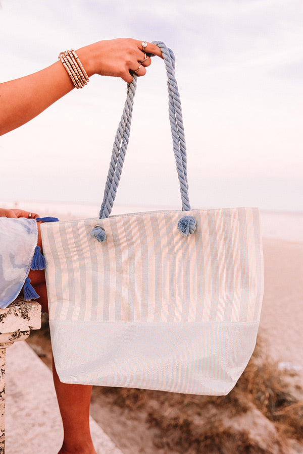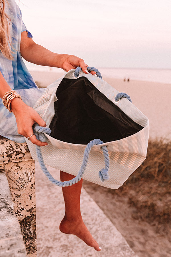 Get vacay ready with our summer approved 'Pretty Shores Tote' featuring chic canvas material with subtle light blue vertical accent stripes, two twisted rope tote handles, and spacious but lightweight silhouette with an additional inside pocket!