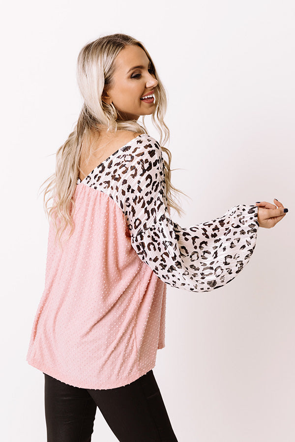 We have no doubt there will be a pretty smile on your face when you complete your OOTD with this adorable pink top featuring lightweight flowy material with subtle polka dot texturing, a v-cut neckline and upper back, a bold black leopard print across the shoulders and down the long loose sleeves, and a relaxed silhouette that falls into a straight hemline!