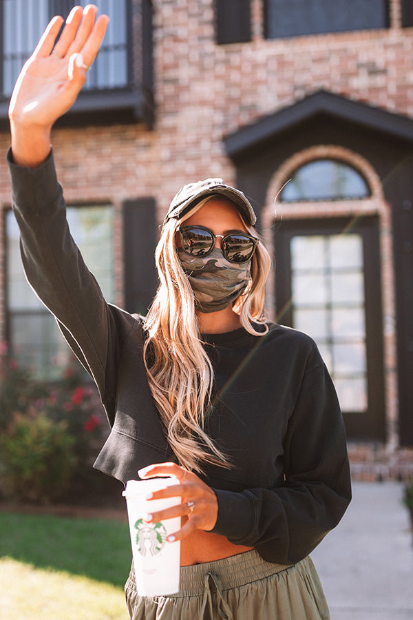 Show off your "pretty style" by wearing this adorable face mask featuring soft lightweight cloth material patterned with a green hued camo print and two ear straps!