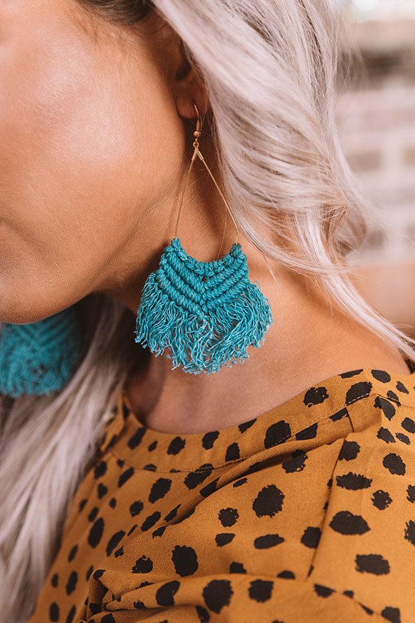You are sure to look "prim and pretty" when you accessorize with these adorable statement earrings featuring dainty dangling gold teardrop hoops with oversized teal colored woven fringe tassels!