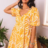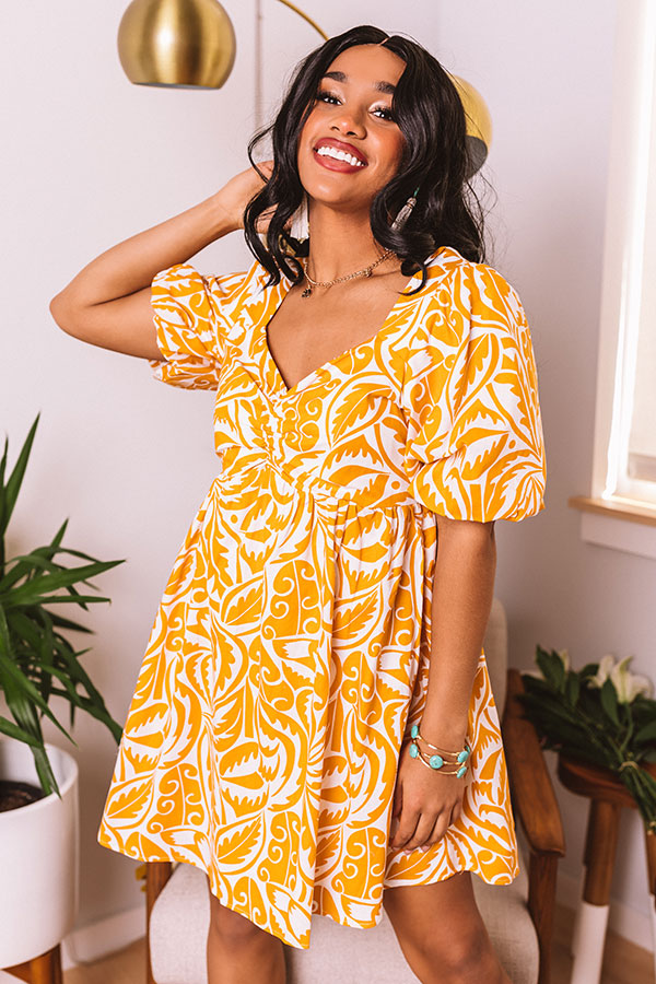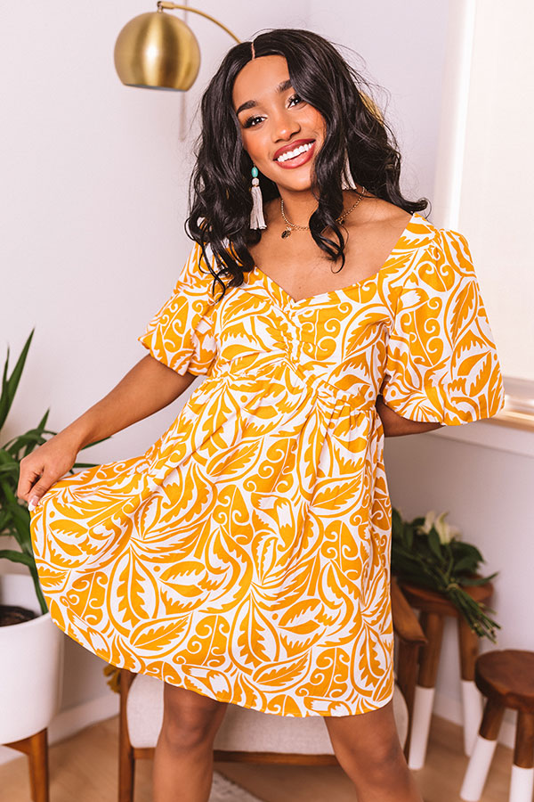 Slay all day in our charming honey colored 'Private Charter Dress' featuring lightweight flowy material patterned with an intricate and oversized leaf print, a v-cut neckline, short bubble sleeves with elastic band cuffs, a square upper back with smocked detailing, and a relaxed but flattering skirt silhouette that falls into a straight mid-thigh length hemline! Measurements