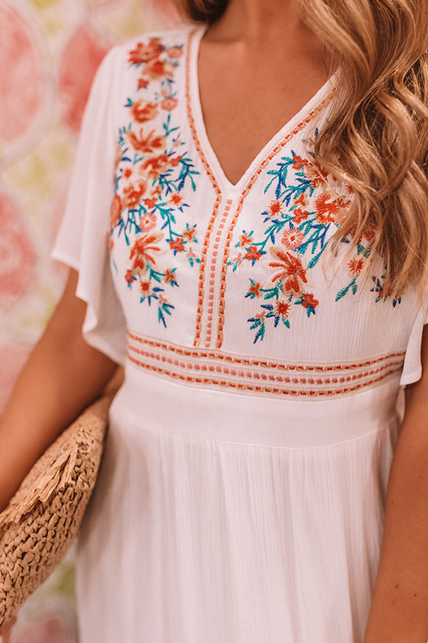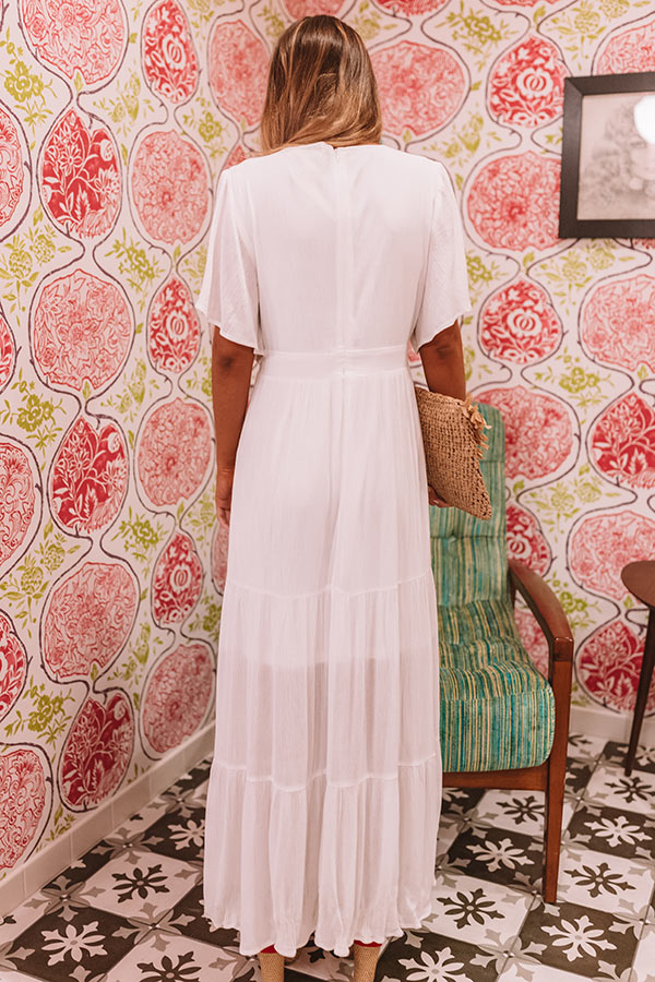 Stay chic in our stunning white "Private Isle" maxi featuring lightweight breezy material with subtle crinkled texturing, a v-cut neckline, an intricately embroidered bodice with a smocked waistline, short draped sleeves, a zip up back closure, and a relaxed tiered skirt silhouette that falls into an uneven floor-length hemline! PLUS, there is a sewn in slip! We have styled this dreamy piece with some red heels, matching statement earrings, and a woven clutch, but you can also wear it with our turquoise "Jewell Lace Up Sandal" and our "Brighton Beach Babe Hat!" Measurements