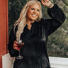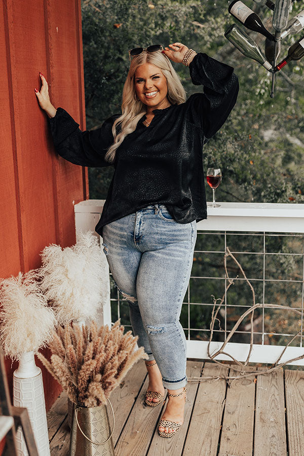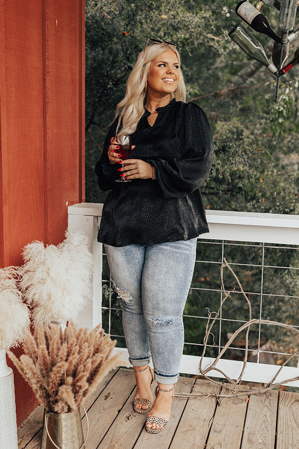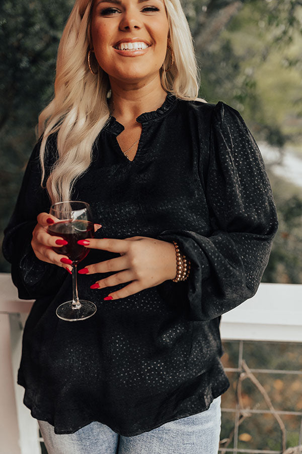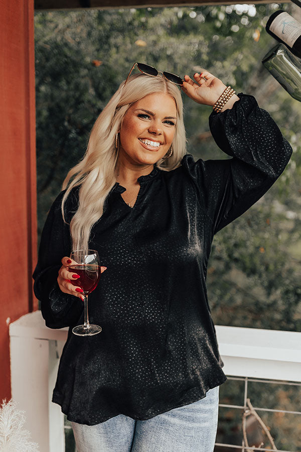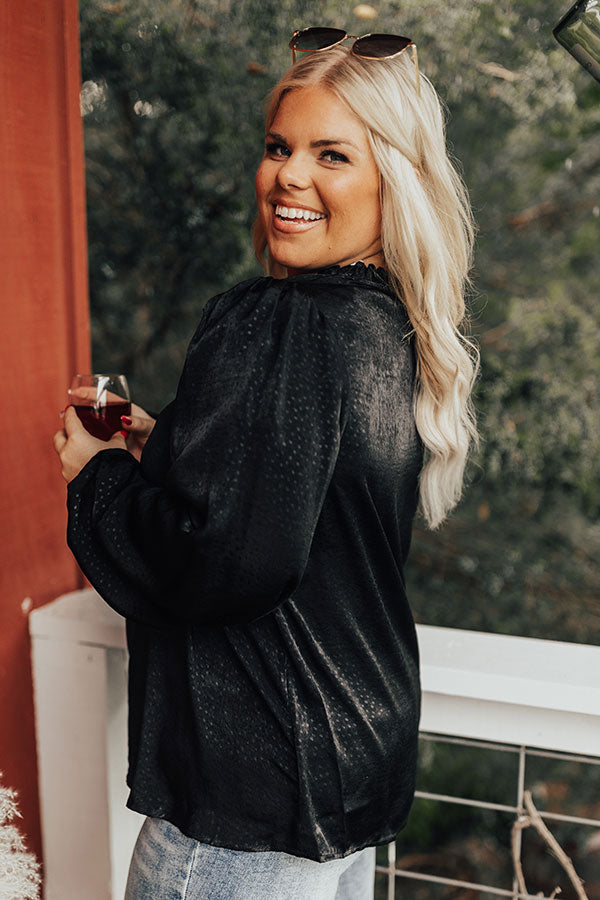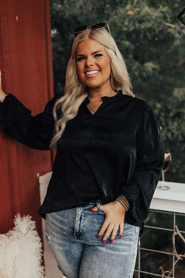 Plus Size - Travel in style with out chic black 'Private Jet Journey Shift Top' featuring sleek lightweight satin like material, a v-cut neckline with ruffled trim detailing, long loose sleeves, and a relaxed silhouette that falls into a rounded hemline! Measurements