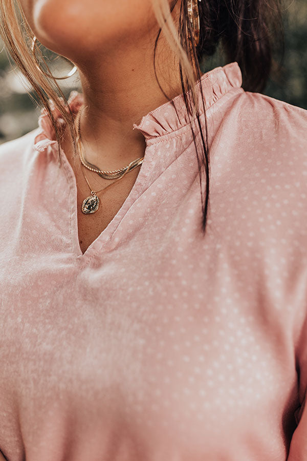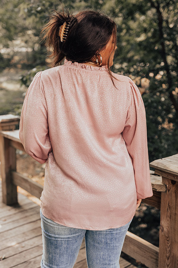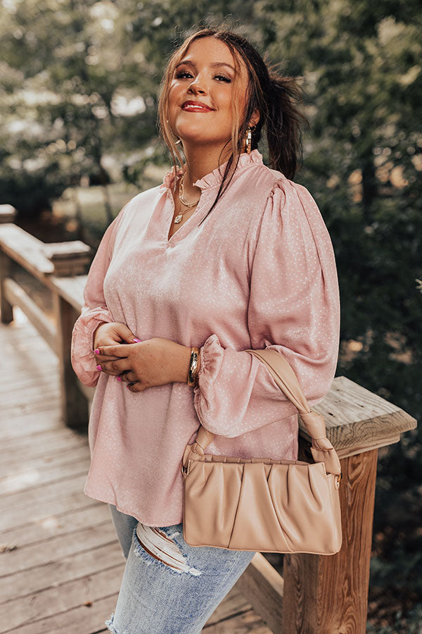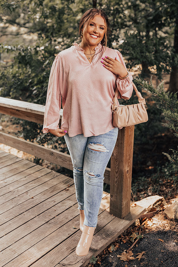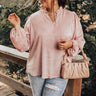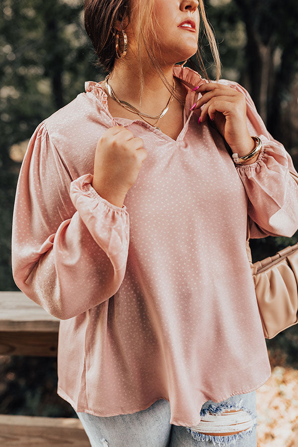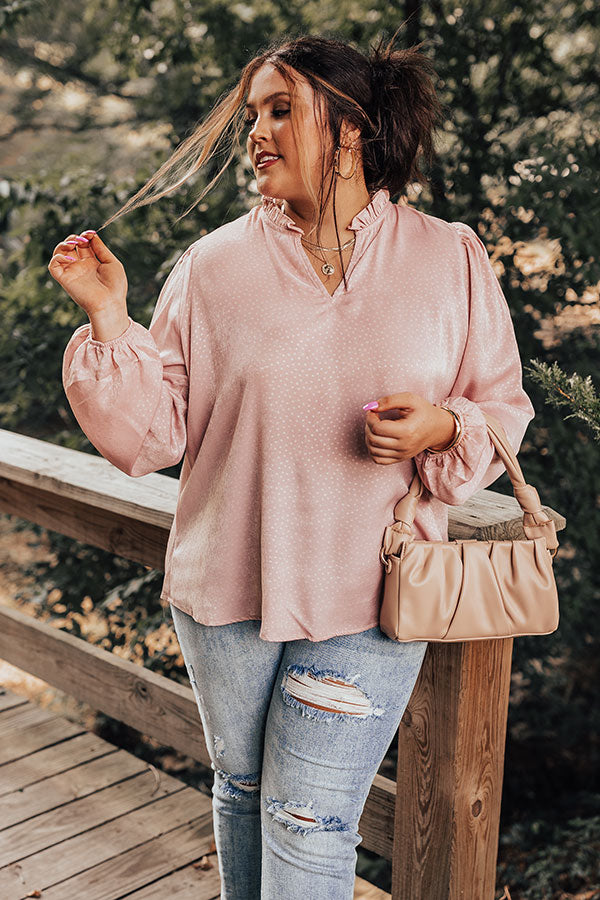 Plus Size - Travel in style with out chic pink 'Private Jet Journey Shift Top' featuring sleek lightweight satin like material, a v-cut neckline with ruffled trim detailing, long loose sleeves, and a relaxed silhouette that falls into a rounded hemline! Measurements