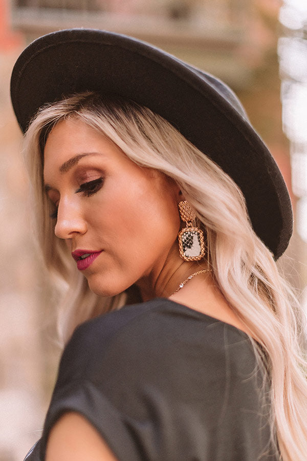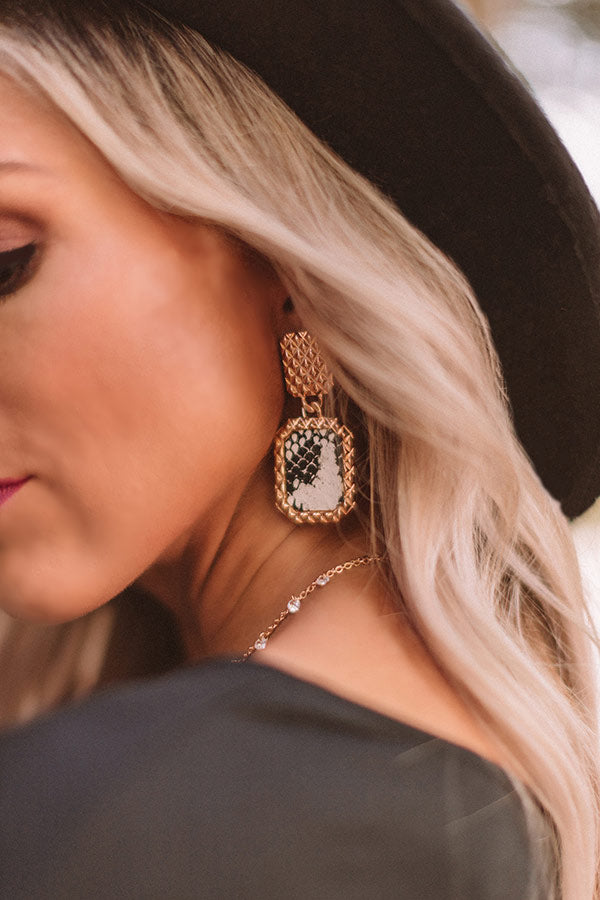Your accessories are 90% of your selfie, so be sure to treat yourself and accessorize with the "Private Jets Only" statement earrings featuring textured gold rectangular studs and dangling white snake print pendants!