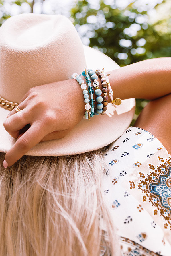 Upgrade your arm candy with our adorable 'Private Park 7 Bracelet Set' featuring seen stretch pieces with a variety of gold and blue beads!