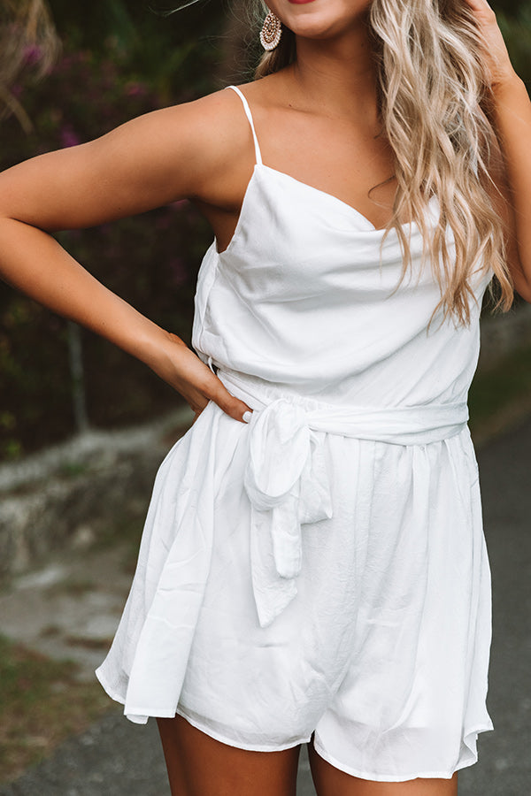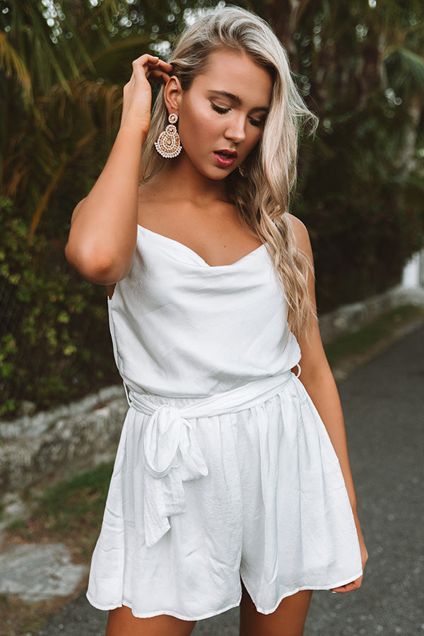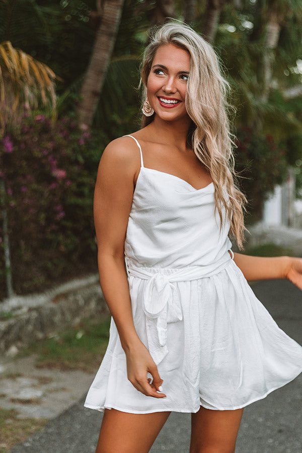You will look like you belong on a "private yacht" when you wear this chic white romper featuring lightweight silky material, a draped neckline, adjustable spaghetti straps with a scooped open back, a fitted elastic waistband with a tie belt, and an ultra relaxed shorts silhouette with uneven upper-thigh length hemlines! You can style this cutie a variety of ways, like with some white wedges, and statement earrings, but you can add a pop of color by wearing it with "The Lyla Sandal in Hot Pink" and our "Uptown Bliss Woven Tote in Hot Pink!" Measurements