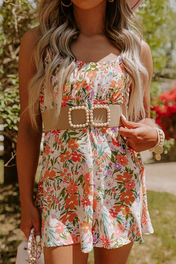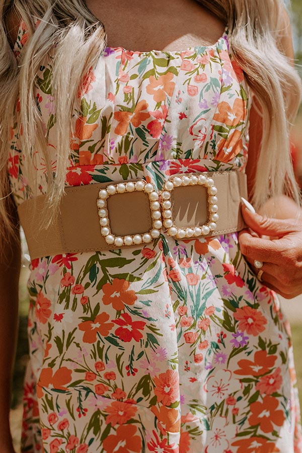 Add a little pizazz to your look with this luxe statement belt featuring a wide iced latte hued strap with two square pearl buckles! Length: 28 inches