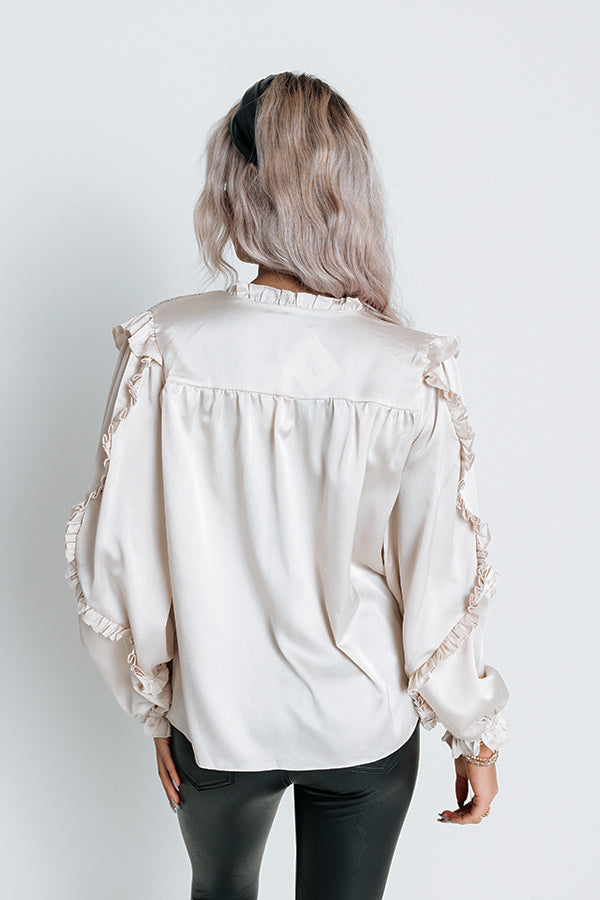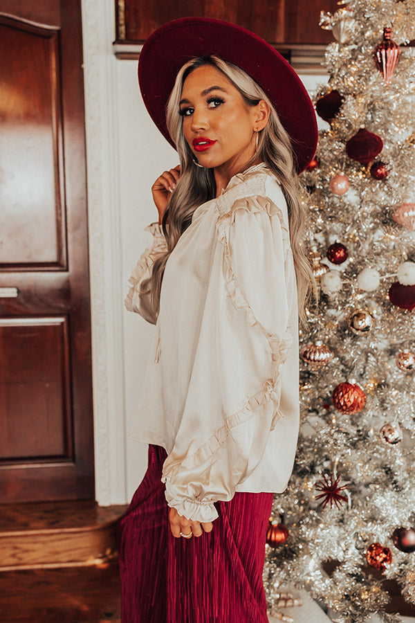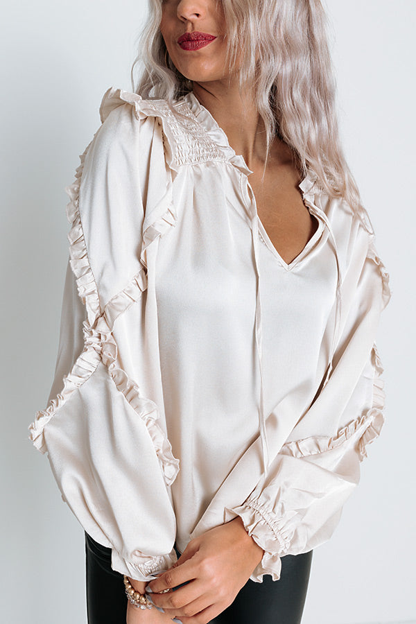 Perfect for wearing to holiday festivities or the office, our chic champagne colored 'Prosecco And Poise' top featuring lightweight satin material, a v-cut neckline with a tie closure, long loose sleeves with ruffled seam detailing, and a relaxed silhouette that falls into a straight hemline!