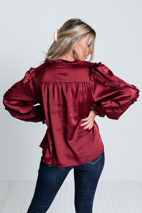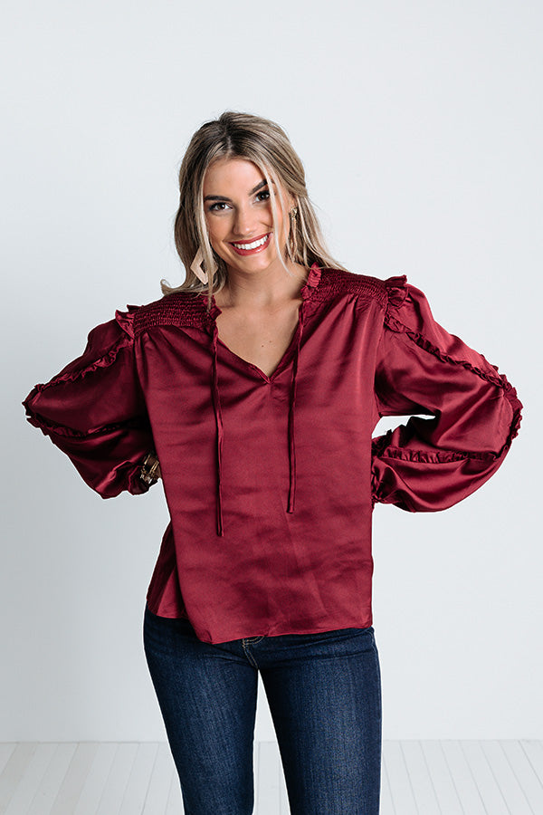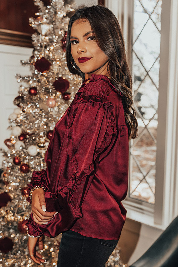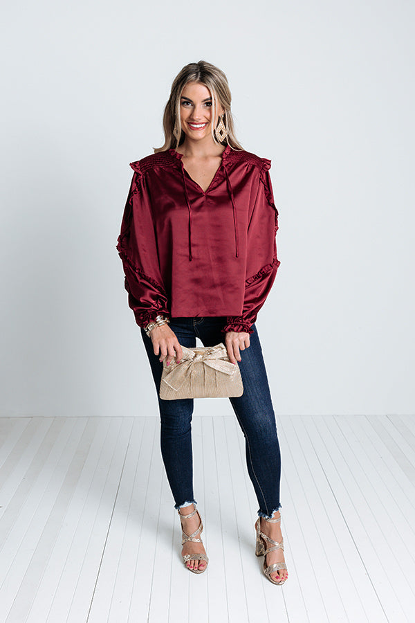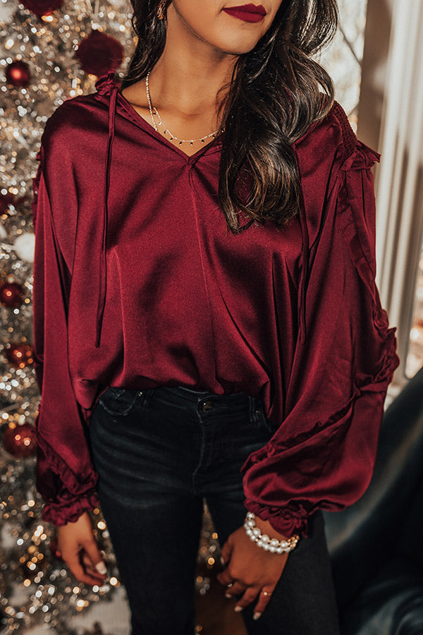 Perfect for wearing to holiday festivities or the office, our chic wine colored 'Prosecco And Poise' top featuring lightweight satin material, a v-cut neckline with a tie closure, long loose sleeves with ruffled seam detailing, and a relaxed silhouette that falls into a straight hemline!