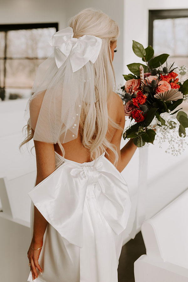 - Short tulle veil with faux pearl embellishment and satin bow design