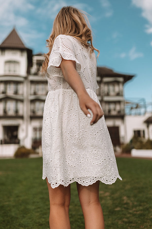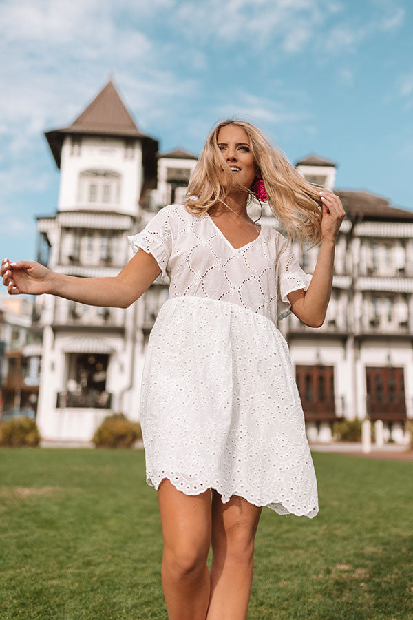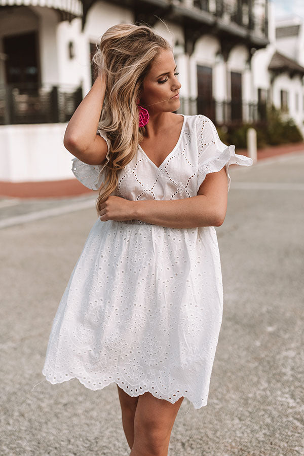 A dress this fabulous is worthy of a glass of prosecco on the pier! This eyelet dress has a v-cut neckline, short flutter sleeves & a relaxed eyelet pierced babydoll silhouette with a scalloped hem.