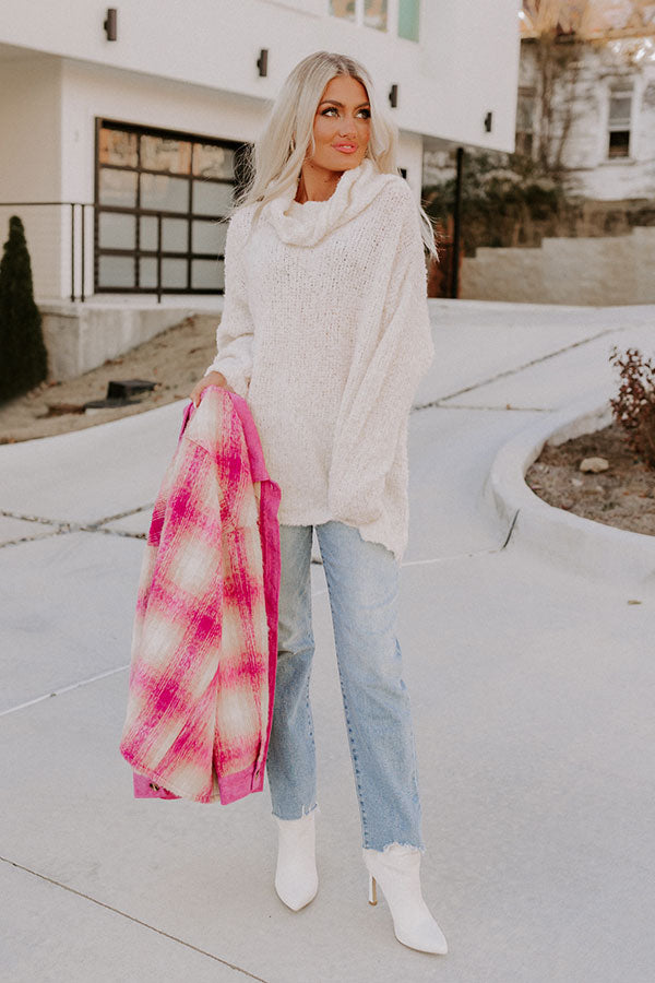 No piece will keep you as warm as our adorable ivory colored "Prosecco Pick Me Up" sweater will with its ultra soft lightweight tight knit material with fuzzy texturing, a bunched turtle neckline, long loose sleeves, and a slouched silhouette that ends in a straight hemline with accent side slits!
