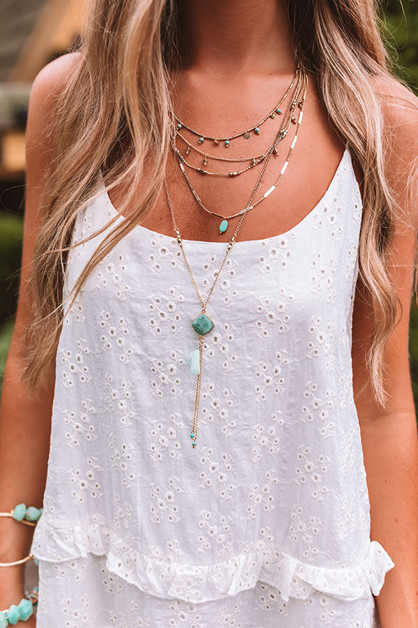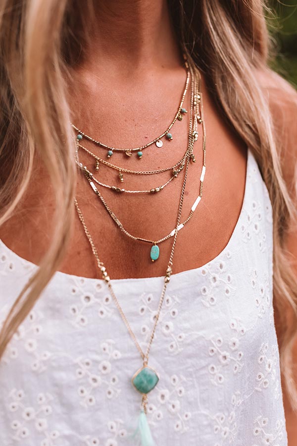 Believe us when we say you will look so pretty accessorizing with this stunning necklace featuring five different layered gold chains with turquoise charm accents!