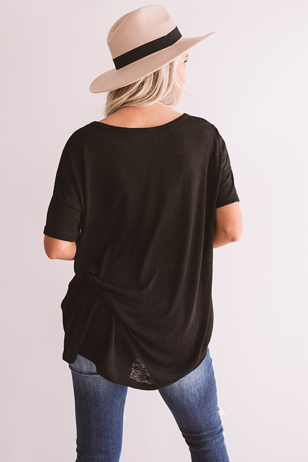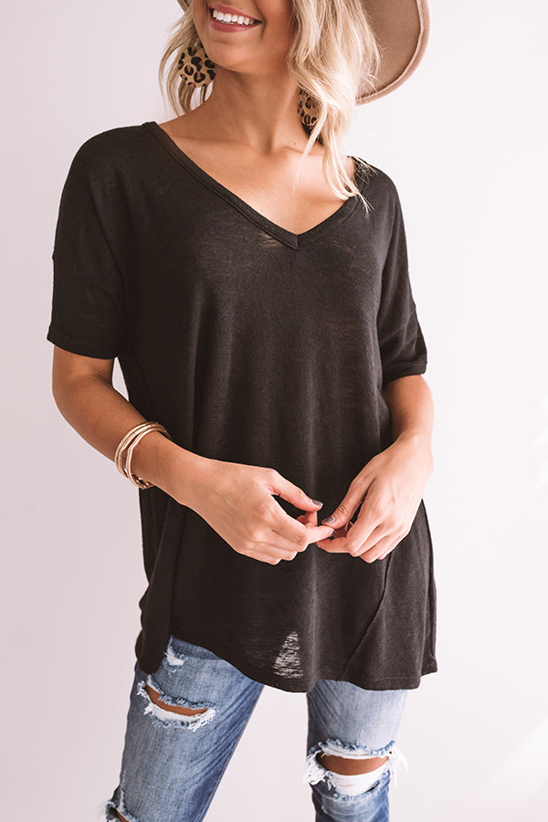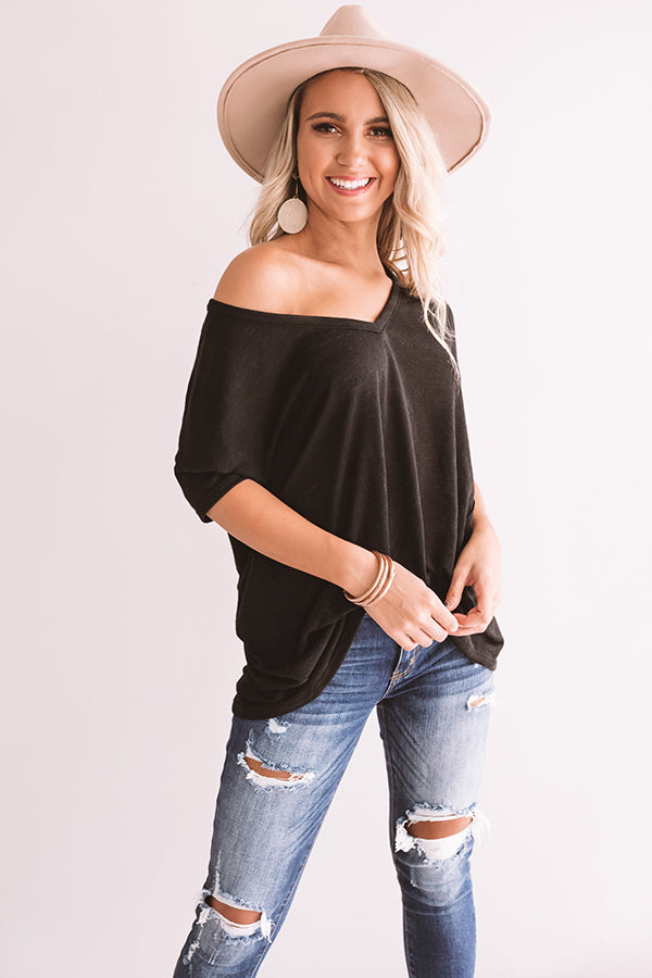 You will be anything but basic in the causal black "Proud Moments" shift tee featuring lightweight material, a wide v-cut neckline that can be worn off one shoulder, loose short sleeves, exposed raw cut accent seams, and an ultra relaxed silhouette that falls into a rounded hemline! Measurements